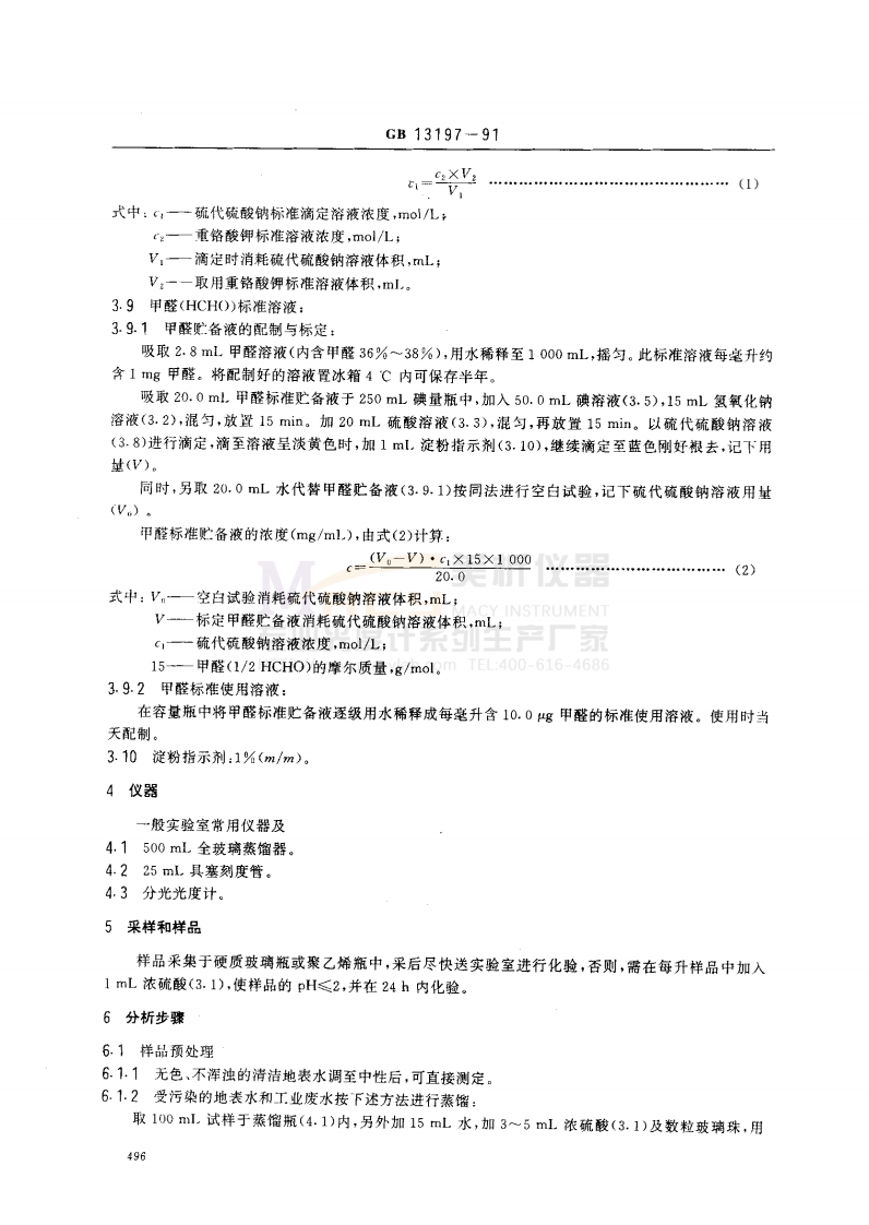 中华人民共和国国家标准水质甲醛的测定GB13197-91乙酰丙酮分光光度法Water quality-Determination of formaldehyde-Acetylacetone spectrophotometric method1主题内容与适用范围本标准规定了测定水中甲醛的乙酰丙酮分光光度法。本标准适用于地表水和工业废水,印染废水不适用。水样中乙醛含量大于3mg/L,丙醛、丁醛、丙烯醛等分别大于5mgL时干扰测定。试样体积为25.0mL,比色皿光程为10mm时,甲醛的最低检出浓度为0.05mg/1,测定上限为3.20mg/T。2原理在过量铵盐存在下,甲醛与乙酰丙酮生成黄色化合物,于414nm波长处进行分光光度测定。3试剂MACY INSTRUMENT本标准所用试剂除另有说明外,均应为符合国家标准或专业标准的分析纯试剂和蒸馏水或同等纯度的水。HTTP://www.macylab.com TEL:400-616-46863.1硫酸(HS()):=1.84g/mL.。3.2氢氧化钠溶液:c(NaOH)=1mol/L,3.3硫酸溶液:c(1/2HS).)=1mol/L。3.4硫酸溶液:c(1/2HSO,)=6mol/1。3.5碘溶液:c(1/212)≈0.05mo/1.。称取6.35g纯碘和20g碘化钾,先溶于少量水,然后再用水稀释至1000mL3.6乙酰丙弱溶液:将50g乙酸鞍、6mL冰乙酸及0.5mL乙酰丙酮试剂溶于100mL水中。此溶液在冰箱内保存至少可稳定一个月。3.7重铬酸钾标准溶液:c(1/6K,Cr0,)=0.0500mol/L.。准确称取在110~130℃烘2h,并冷至室温的重铬酸钾2.4516g,用水溶解后移入1000ml,容量瓶中,用水稀释至标线,摇匀。3.8硫代藐酸纳标准滴定溶液:c(NaS:O,·5HO)≈0.05mol/L。称取12.5g硫代硫酸钠溶于煮沸并放冷的水中,稀释至1000L。加入0.4g氢氧化钠,贮于棕色瓶内,使用前用重铬酸钾标准溶液标定,其标定方法如下:于250ml.碘址瓶内,加入约1g碘化钾及50m1.水,加入20.0mL重铬酸钾标准溶被(3.7),5mL硫酸溶液(3.4),混匀,于暗处放?5mn。用硫代硫酸钠溶液滴定,待滴定至溶液是淡黄色时,潮入1mL.淀粉指示剂(3.10),继续滴定至蓝色刚好退去,记下用址(V,)。硫代硫酸钠标准滴定溶液浓度(mol/L.),由式(1)计算:国家环境保护局1991-08-31批准1992-06-01实施195