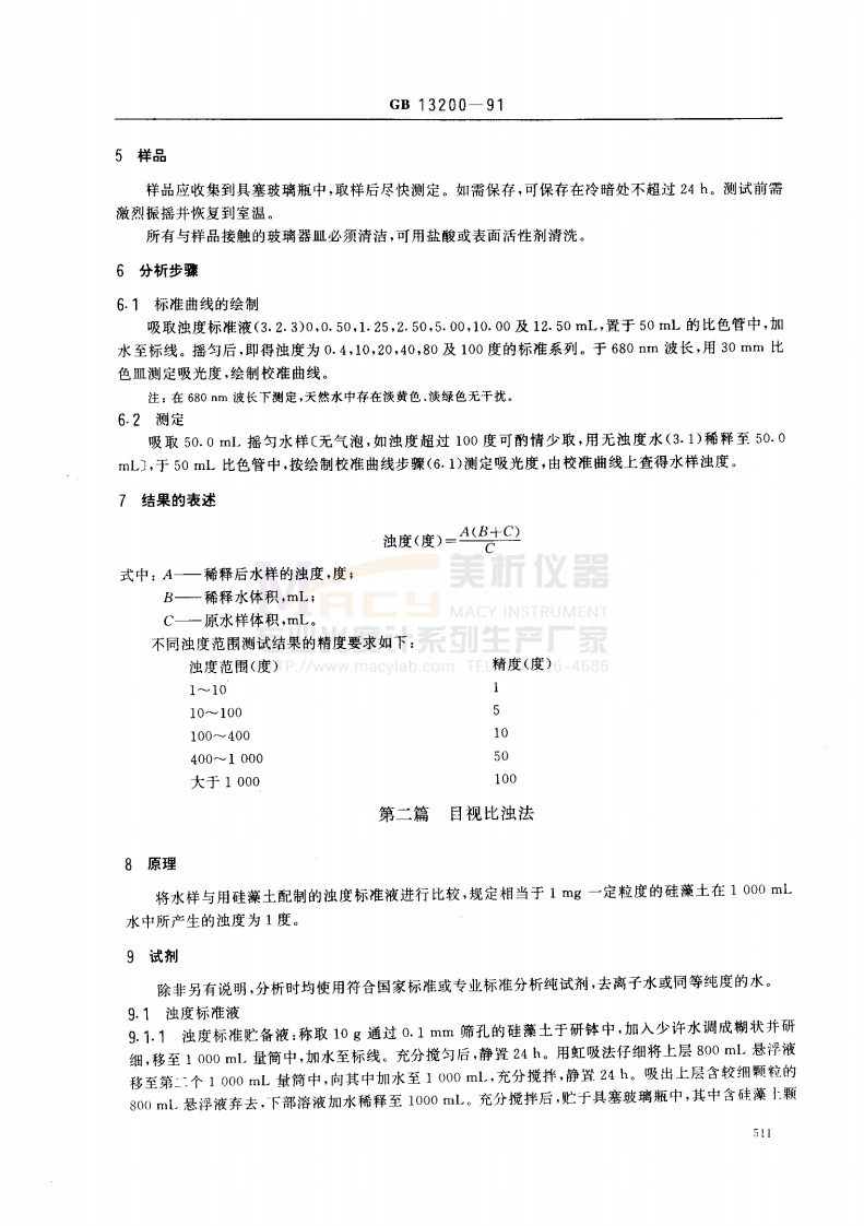 中华人民共和国国家标准水质浊度的测定GB13200-91Water quality-Determination of turbidity本标准参照采用国际标准1S07027一1984《水质一浊度的测定》。1主题内容与适用范围1.1本标准规定了两种测定水中浊度的方法。第一篇分光光度法,适用于饮用水、天然水及高浊度水,最低检测浊度为3度。第二篇目视比浊法,适用于饮用水和水源水等低浊度的水,最低检测浊度为1度。1,2水中应无碎屑和易沉颗粒,如所用器皿不清洁,或水中有溶解的气泡和有色物质时干扰测定。第一篇分光光度法2原理在适当温度下,硫酸胼与六次甲基四胺聚合,形成白色高分子聚合物,以此作为浊度标准液,在一定条件下与水样浊度相比较。MACY INSTRUMENT3试剂专业光度计系列生产厂家除非另有说明,分析时均使用符合国家标准或专业标准分析纯试剂,去离子水或同等纯度的水。3.1无浊度水将蒸馏水通过0.2以m滤膜过滤,收集于用滤过水荡洗两次的烧瓶中。3.2浊度标准贮备液3.2.11g/100mL硫酸肼溶液称取1.000g硫酸肼〔(NzH)HS)溶于水,定容至100mL。注:疏酸肼有毒、致癌」3.2.210g/100mL六次甲基四胺溶液称取10.00g六次甲基四胺〔(CH:)N溶于水,定容至100mL。3.2.3浊度标准贮备液吸取5.00mL硫酸肼溶液(3.2.1)与5.00ml六次甲基四胺溶液(3.2.2)于100mL容址瓶中,混匀。于25±3℃下静肾反应24h。冷后用水稀释至标线,混匀。此溶液浊度为400度。可保存一个月。4仪器一般实验室仪器和4.150mL具塞比色管。4.2分光光度计。国家环境保护局1991-08-31批准1992-06-01实施510