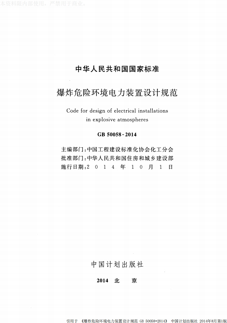 本资料限内部使用,严禁用于商业。UDC中华人民共和国国家标准PGB50058-2014爆炸危险环境电力装置设计规范Code for design of electrical installationsin explosive atmospheres2014-01-29发布2014-10-01实施中华人民共和国住房和城乡建设部联合发布中华人民共和国国家质量监督检验检疫总局引用于《堡炸危险环境申力装置设计规范GB50058-2014》中国计划出版社2014年8月第1版