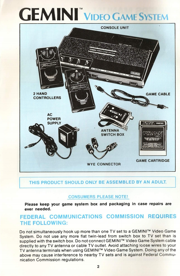 OWNERS MANUALGuide No.98662MODEL NO.2510GEMINIVIDEO GAME SYSTEMGEMINI VIDEO GAME SYSIFMCoEc回ALLOWS YOU TO PLAY THE MANY EXCITING GAMESDESIGNED FOR THE ATARI 2600 VCSs●三s回Imported by:Coleco (Canada)Limitee4000 St.Ambroise StreetMontreal,Quebec©1983,Coleco(Canada)LimiteeH4C 2C8