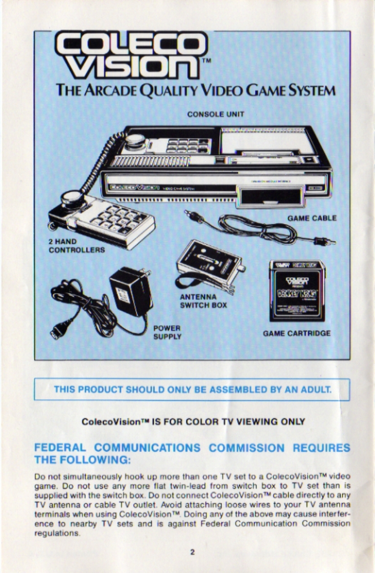 OWNERS MANUALGuide No.78200AMODEL NO.2400COLEC▣SIO几THE ARCADE QUALITYVIDEO GAME SYSTEM层COEC⊙aen wnoc4MwFor Ages 8 to AdultCOLECOCOLECO INDUSTRIES INC.,AMSTERDAM,NEW YORK 120101982.Coleco Industries,Inc.Printed in U.S.A.