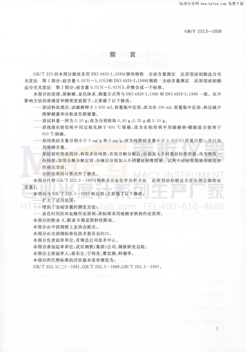 1Cs77.080.01H11GB中华人民共和国国家标准GB/T223.5-2008代替GB/T223.5-1997钢铁酸溶硅和全硅含量的测定还原型硅钼酸盐分光光度法Steel and iron-Determination of acid-soluble silicon and total silicon content-Reduced molybdosilicate spectrophotometric methodHTTOaRanwc6Part 1:Silicon contents between 0.05 and 1.0%&ISO 4829-2:1988Steel and iron-Determination of total silicon content-Reducedmolybosilicate spectrophotometric method-Part 2:Siliconcontents between 0.01 and 0.05%,MOD)2008-08-19发布2009-04-01实施中华人民共和国国家质量监督检验检疫总局数码伪中国国家标准化管理委员会发布