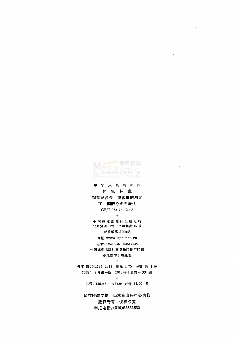 ICS77.080.01H11中华人民共和国国家标准GB/T223.232008代替GB/T223.23~223.24一1994钢铁及合金镍含量的测定丁二酮肟分光光度法美仪器Iron,steel and alloy-Determination of nickel content-The dimethylglyoxime spectrophotometric method2008-05-13发布2008-11-01实施中华人民共和国国家质量监督检验检疫总局中国国家标准化管理委员会发布