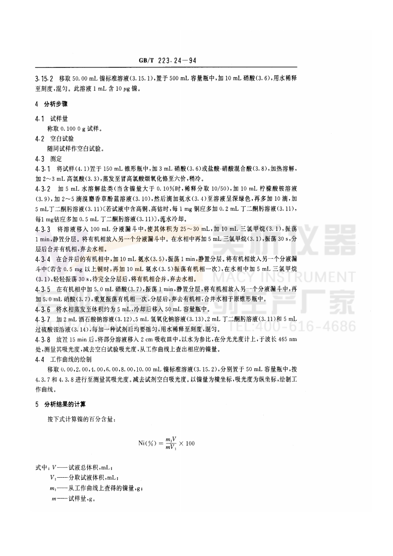 中华人民共和国国家标准钢铁及合金化学分析方法萃取分离丁二酮肟分光光度法测定镍量GB/T223.24-94Methods for chemical analysis of iron,steel and alloy代替GB223.24一82The extraction seperation-The dimethylglyoximespectrophotometric method for the determination of nickel content1主题内容与适用范围本标准规定了用萃取分离-丁二酮肟分光光度法测定镍量本标准适用于生铁、碳素钢、合金钢和精密合金中低含量镍的测定。测定范围:0.010%~0.50%。2方法提要试样用酸溶解,以柠檬酸铵掩蔽铁,加丁二酮肟与镍生成丁二酮肟镍,用三氯甲烷萃取,再用稀硝酸反萃取于水相中,然后在强碱性介质中,以过硫酸铵为氧化剂,镍与丁二酮肟生成红色配合物,测量其吸光度。移取液中锰量小于25mg,铜量小于3.5mg,钴量小于15mg不干扰测定。INSTRUMENT3试剂3.1三氯甲烷。光度系列生产家ww.macylab.com TEL:400-616-46863.3高氯酸(p1.67g/mL)。3.4氨水(0.90g/mL)3.5氨水(1+30)。3.6硝酸(2十3)。3.7硝酸(1+20)。3.8盐酸-硝酸混合酸:将一份盐酸(p1.19g/mL)、一份硝酸(p1.42g/mL)和二份水相混合。3.9柠檬酸铵溶液(20%)。3.10溴麝香草酚蓝溶液(0.1%):称取0.1g溴麝香草酚蓝,加1mL氢氧化钠溶液(3.13)和50mL水溶解后,用水稀释至100mL,混匀。3.11丁二酮肟溶液(1%):用乙醇(3.2)配制。3.12酒石酸钠溶液(30%)。3.13氢氧化钠溶液(10%)。3.14过硫酸铵溶液(4%)。3.15镍标准溶液。3.15.1称取0.1000g纯镍(99.99%以上),置于150mL锥形瓶中,加20mL硝酸(3.6),加热溶解后,冷却至室温,移入1000mL容量瓶中,用水稀释至刻度,混匀。此溶液1mL含100g镍。国家技术监督局1994-01-17批准1994-10-01实施