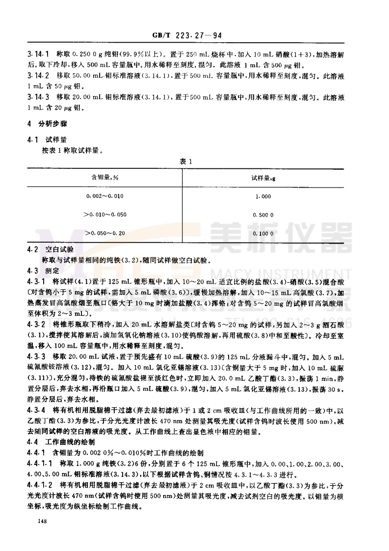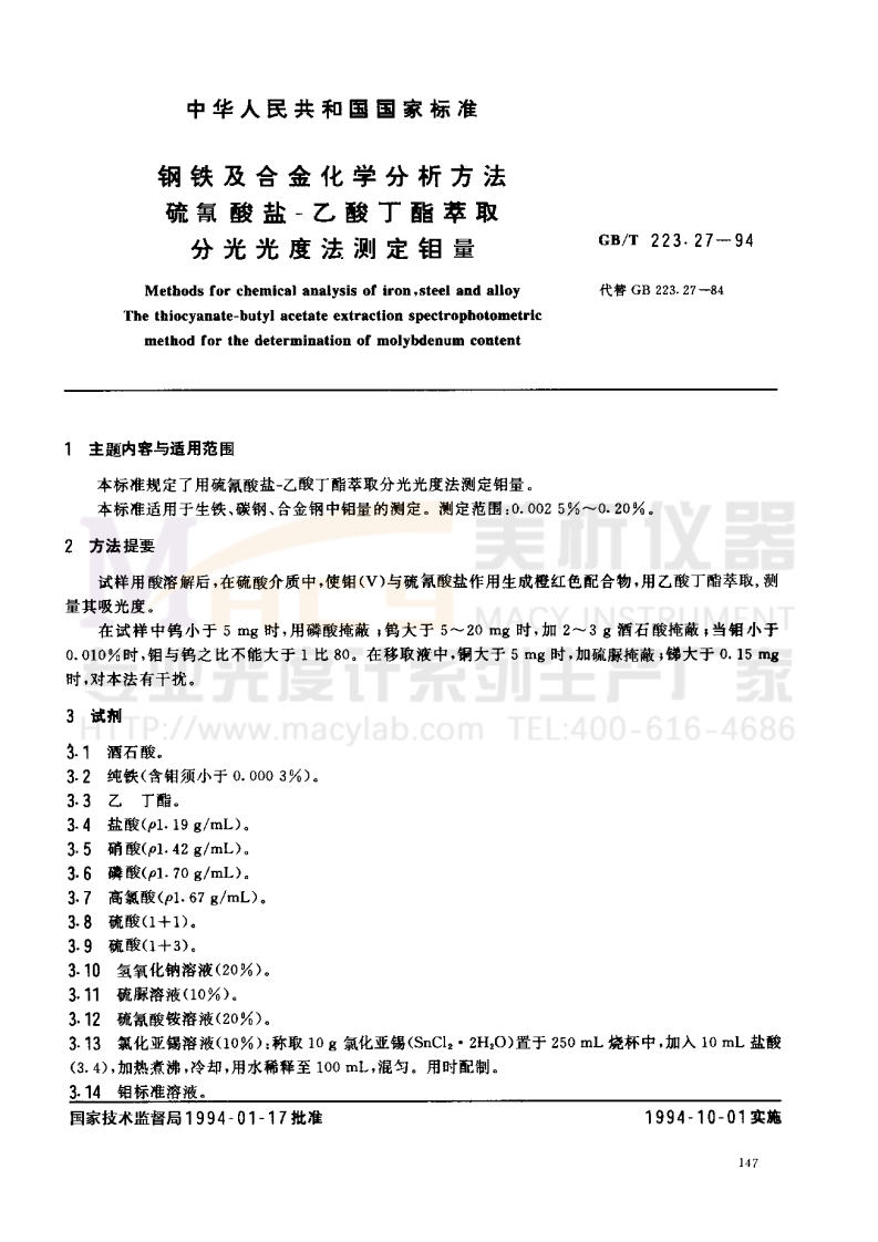 中华人民共和国国家标准钢铁及合金化学分析方法硫氰酸盐~乙酸丁酯萃取分光光度法测定钼量GB/T223.27-94Methods for chemical analysis of iron,steel and alloy代替GB223.27一84The thiocyanate-butyl acetate extraction spectrophotometricmethod for the determination of molybdenum content1主题内容与适用范围本标准规定了用硫氰酸盐-乙酸丁酯萃取分光光度法测定钼量。本标准适用于生铁、碳钢、合金钢中相量的测定。测定范围:0.0025%~0.20%。■2方法提要试样用酸溶解后,在硫酸介质中,使钼(V)与疏氰酸盐作用生成橙红色配合物,用乙酸丁酯萃取,测量其吸光度。在试样中钨小于5mg时,用磷酸掩蔽,鹤大于5~20mg时,加2~3g酒石酸掩蔽当钼小于0.010%时,钼与钨之比不能大于1比80。在移取液中,铜大于5mg时,加硫踩掩蔽;锑大于0.15mg时,对本法有干扰。之7元出二☑3试剂TP://www.macylab.com TEL:400-616-46863.1酒石酸。3.2纯铁(含钼须小于0.0003%)。3.3乙丁酯。34盐酸(p1.19g/mL).3.5硝酸(p1.42g/mL),3.6磷酸(p1.70g/mL)。3.7高氯酸(pl.67g/mL)。3.8硫酸(1+1)。3.9虢酸(1+3).3.10氢氧化钠溶液(20%)。3.11碗脲溶液(10%).3.12硫氰酸铵溶液(20%)。3.13氯化亚锡溶液(10%):称取10g氯化亚锡(SCl2·2H20)置于250mL烧杯中,加入10mL盐酸(3.4),加热煮沸,冷却,用水稀释至100mL,混匀。用时配制。3.14钼标准溶液。国家技术监督局1994-01-17批准1994-10-01实施147
