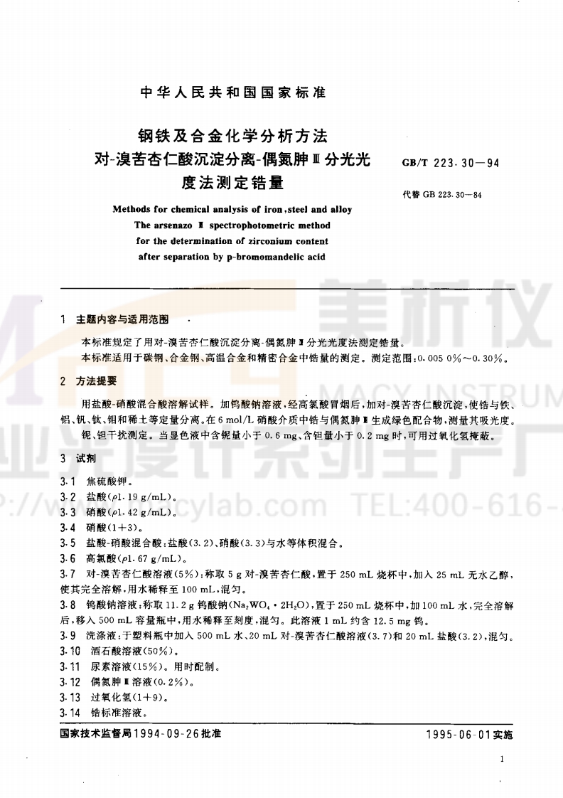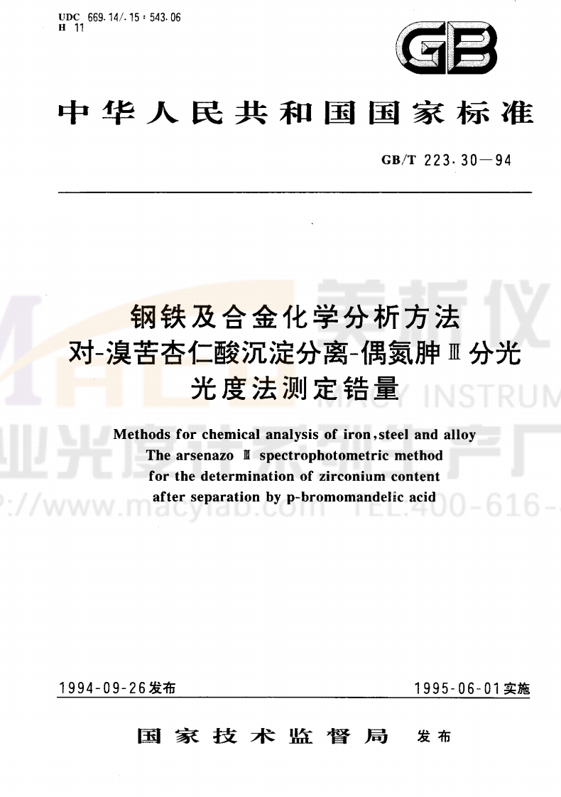UDC669.14/.15:543.06H11中华人民共和国国家标准GB/T223.30-94钢铁及合金化学分析方法对-溴苦杏仁酸沉淀分离-偶氨胂Ⅲ分光光度法测定锆量INSTRUMethods for chemical analysis of iron,steel and alloyThe arsenazo spectrophotometric methodfor the determination of zirconium content//www.mafter separation by p-bromomandelic acid0-6161994-09-26发布1995-06-01实施国家技术监督局发布