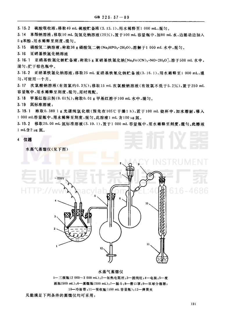 中华人民共和国国家标准钢铁及合金化学分析方法蒸馏分离-靛酚蓝光度法测定氨量GB223.37-89Methods for chemical analysis of iron,steel and alloy代替GB223.37一85The indophenol blue photometric method for the determinationof nitrogen content after distillation separation1主题内容与适用范围本标准规定了用蒸馏分离-靛酚蓝光度法测定氮量。本标准适用于纯铁、碳钢、合金钢、高温合金和精密合金中氮量的测定,不适用于不加铝冶炼的硅铜及其型材中氮量的测定,测定范围:0.0010%~0.050%.2方法提要试样用适当的酸分解,其中的氮转变成相应酸的铵盐,在过量碱的作用下,水蒸气蒸馏分离氨,用稀疏酸吸收蒸出液,然后,在亚硝基铁氰化钠和次氯酸钠存在下,氨与酚生成蓝色的靛酚络合物,测量其吸光度。3试剂MACY INSTRUMENT本方法中所用水均为无氨水。3.1硫酸钾(固体)。计系列生产厂3.2氟化钠(固体)。3.3疏酸(pl.84g/mL),优级纯.nacylab.C0mTEL:400-616-46863.4硫酸(1+4).3.5氢氟酸(p1.15g/mL),优级纯。3.6磷酸(pl.70g/mL),优级纯。3.7硫酸-磷酸混合酸:于200mL水中,在搅拌下缓缓加入10mL硫酸(3.3),加40mL磷酸(3.6),混匀。3.8盐酸(1+1),优级纯。3.9高氯酸(1+1),优级纯3.10过氧化氢(p1.10g/mL).3.11氢氧化钠溶液:称取500g优级纯氢氧化钠,溶于800mL水中,加数粒锌粒,加热煮沸10mi,除去残余的锌粒,取下冷却,用水稀释至1000mL,混匀,贮于塑料瓶中。3.12氢氧化钠溶液(0.8%):移取16mL氢氧化钠溶液(3.11),用水稀释至1000mL,混匀。3.13疏酸吸收液:3.13.1疏酸贮备液:移取28mL硫酸(3,3),级慢地加入到700mL水中,冷却后,用水稀释至1000mL,混匀。中华人民共和国冶金工业部1989-02-21批准1990-07-01实施190