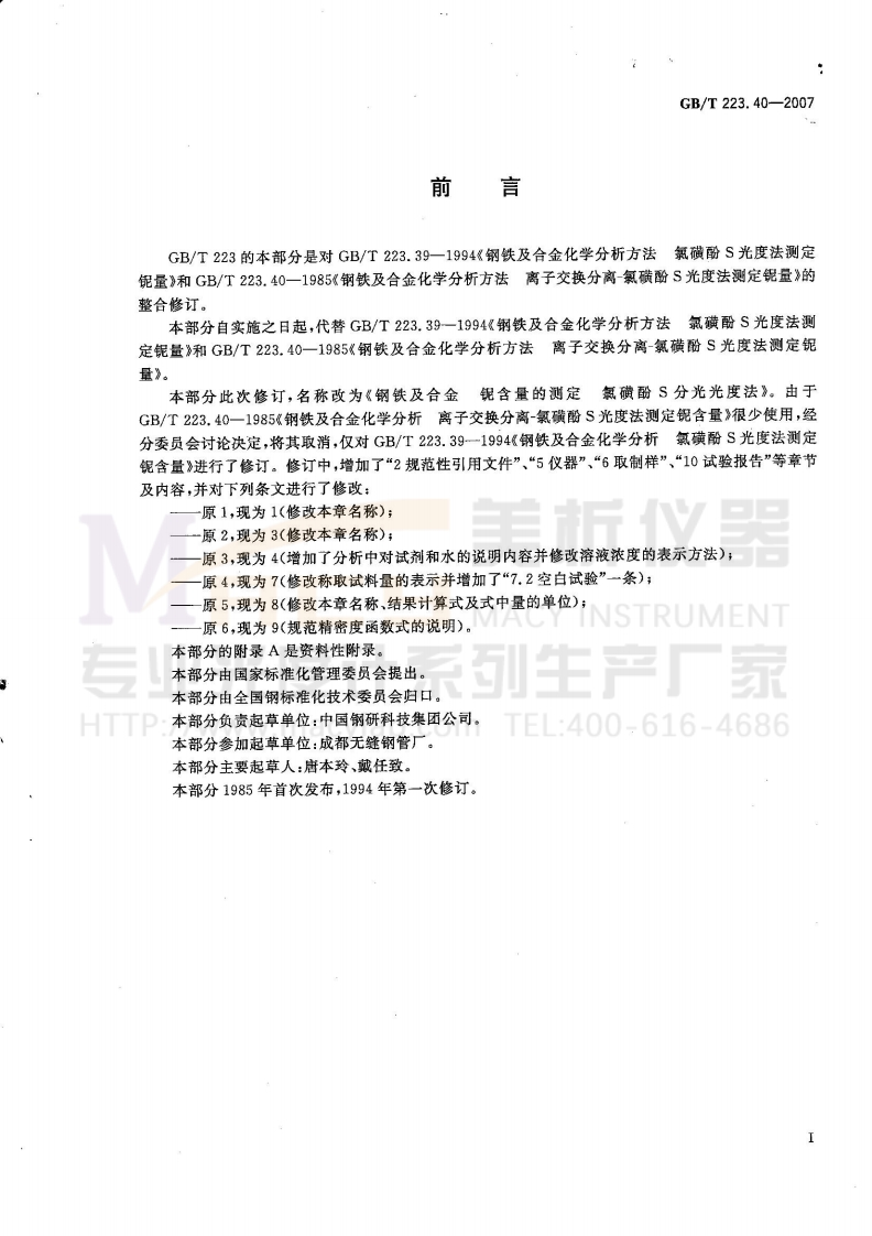 1Cs77.040.30H11GB中华人民共和国国家标准GB/T223.40-2007代替GB/T223.39一1994和GB/T223.40-1985钢铁及合金铌含量的测定氯磺酚S分光光度法Iron,steel and alloy-Determination of niobium contentby the sulphochlorophenol S spectrophotometric method专业光度宗到生HTTP://www.macylab.com TEL:400-616-46862007-03-09发布2007-10-01实施中华人民共和国国家质量监督检验检疫总局中国国家标准化管理委员会发布