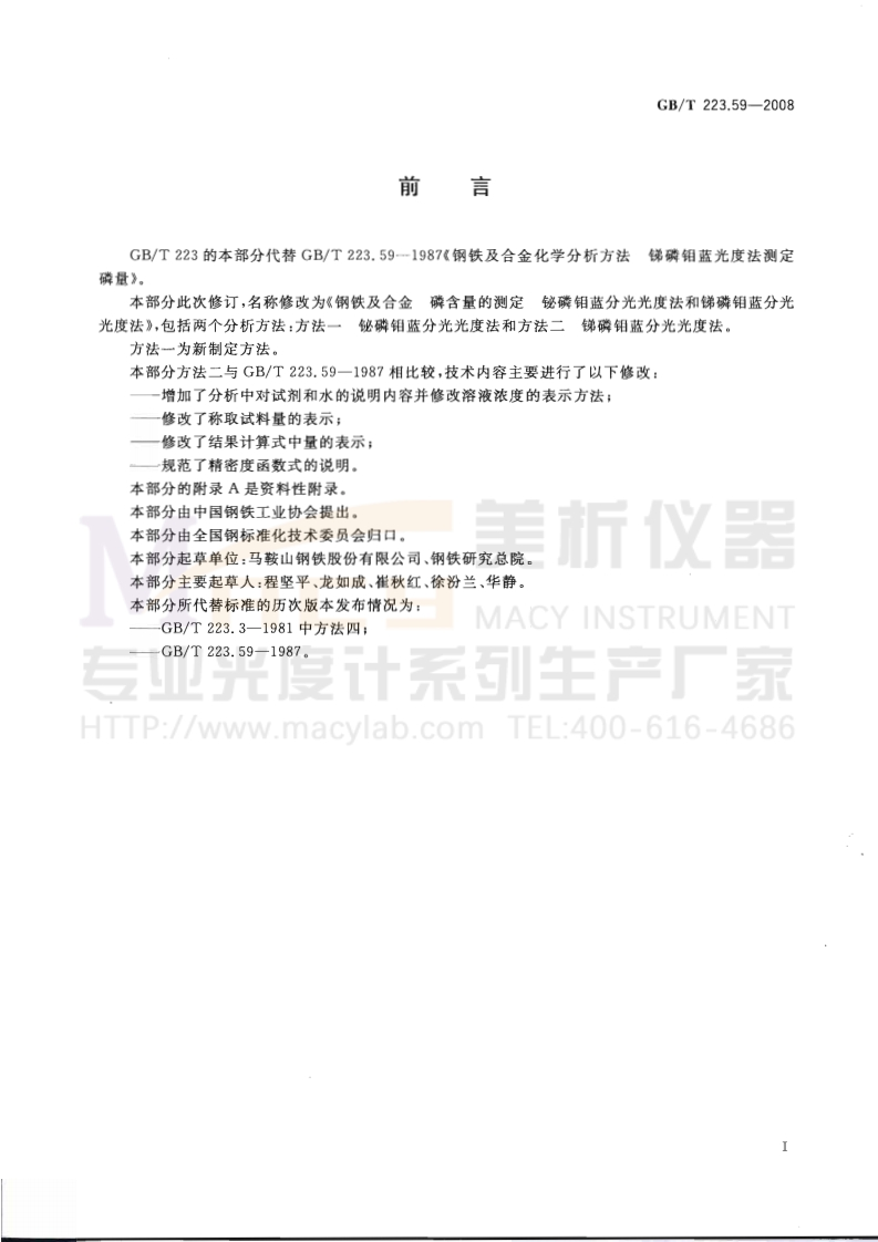 1Cs77.080.01H11GB中华人民共和国国家标准GB/T223.59-2008代替GB/T223.59-1987钢铁及合金磷含量的测定铋磷钼蓝分光光度法和锑磷钼蓝分光光度法RUMENTIron,steel and alloy-Determination of phosphorus content-Bismuth phosphomolybdate blue spectrophotometric method andantimony phosphomolybdate blue spectrophotometric method2008-08-19发布2009-04-01实施中华人民共和国国家质量监督检验检疫总局中国国家标准化管理委员会发布