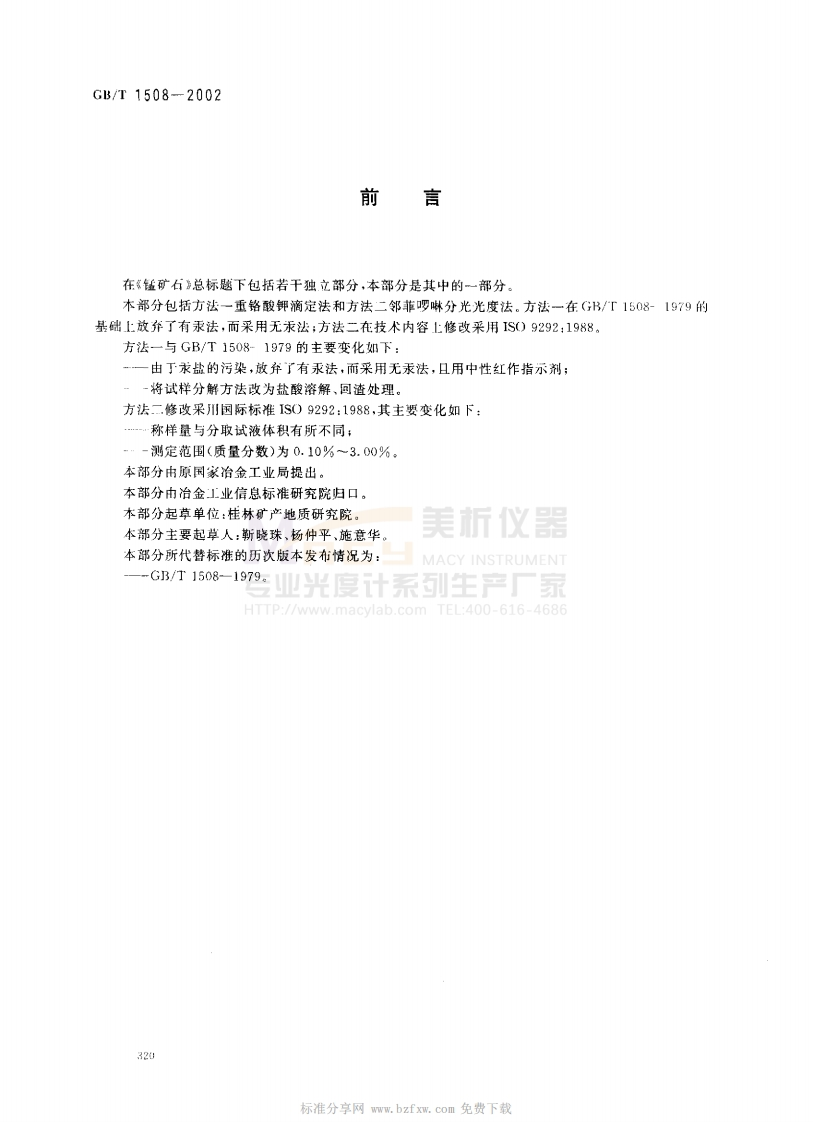 ICs73.060.20D32GB中华人民共和国国家标准GB/"T15082002代林(5T18-1979锰矿石全铁含量的测定重铬酸钾滴定法和邻菲罗啉分光光度法Manganese ores-Determination of total iron contentPotassium dichromate titrimetric method and 1,10-phenanthroline spectrophotometric method2002-09-11发布2003-04-01实施中华人民共和国国家质量监督检验检疫总局发布