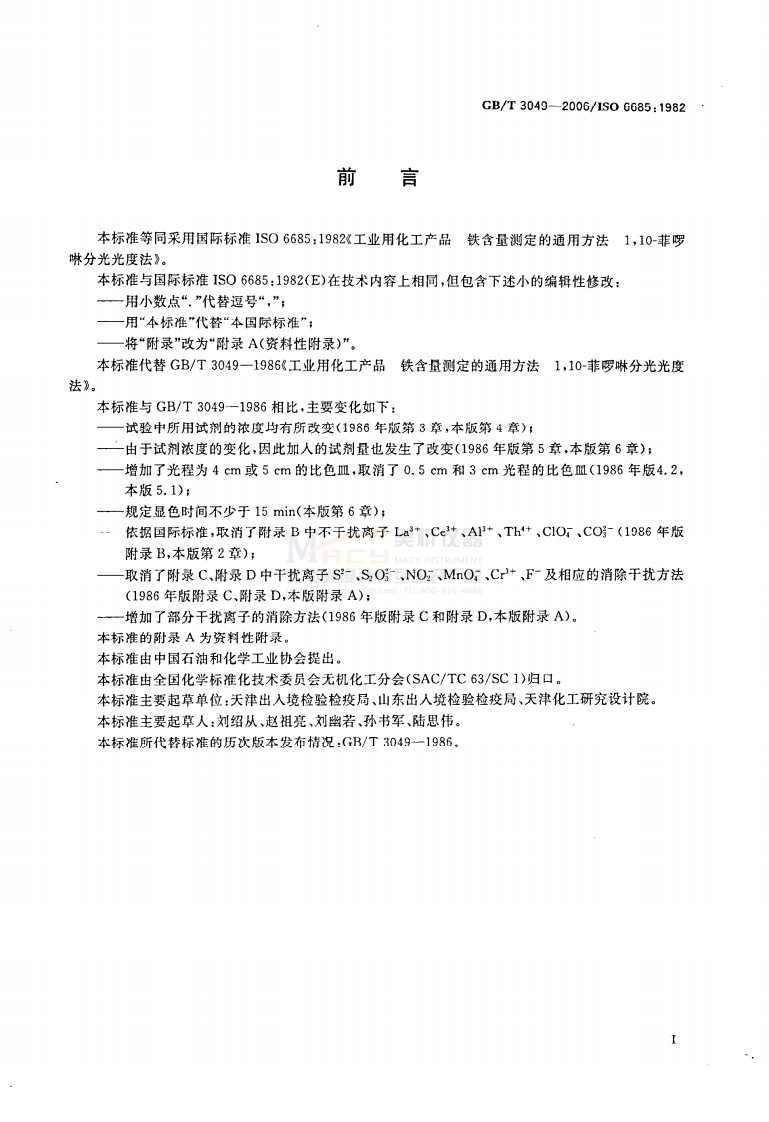ICs71.040.40G10GB中华人民共和国国家标住GB/T3049-2006/IS06685:1982代替GB/T3049一1986工业用化工产品铁含量测定的通用方法1,10-菲啰啉分光光度法Chemical products for industrial use-General method for determinationof iron content-1,10-Phenanthroline spectrophotometric method(ISO6685:1982,IDT)2006-12-29发布2007-06-01实施中华人民共和国国家质量监督检验检疫总局中国国家标准化管理委员会发布
