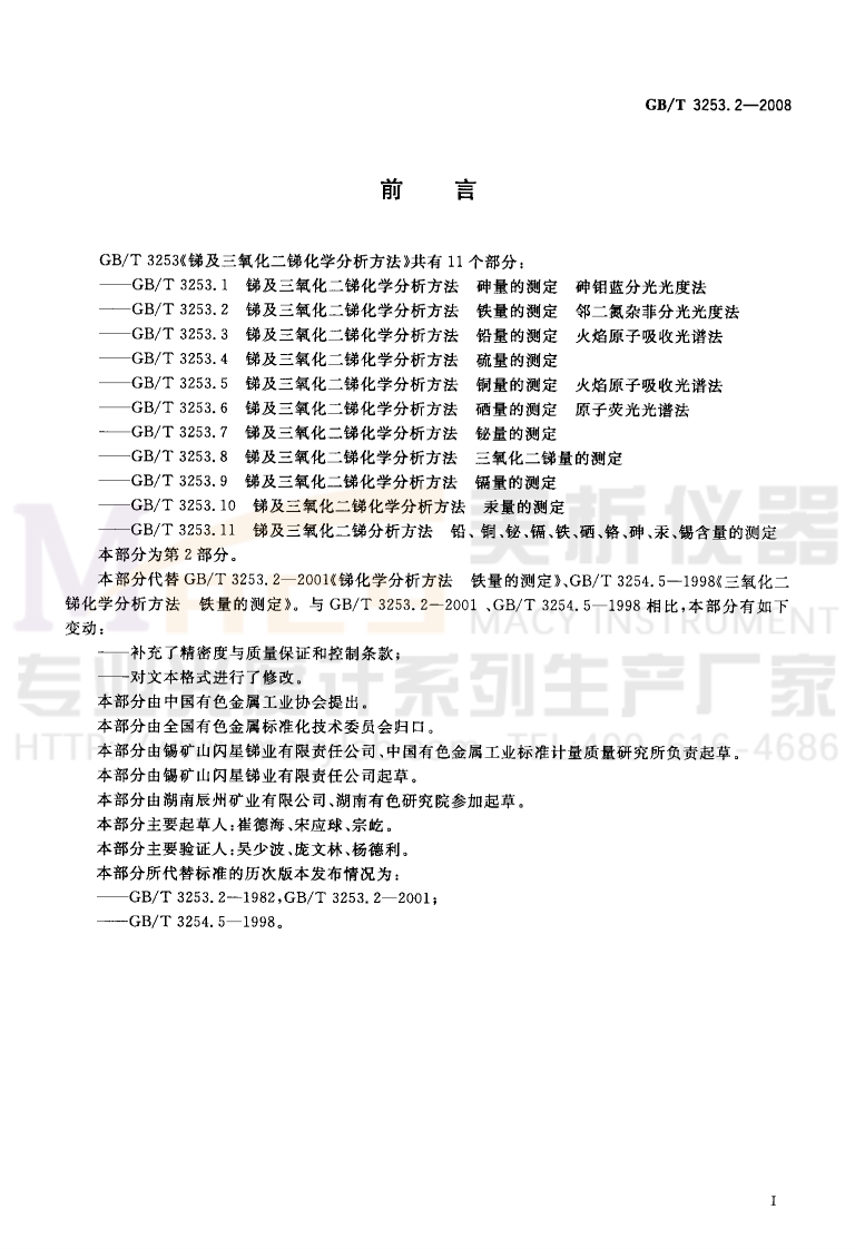 1CS77.120.99H13中华人民共和国国家标准GB/T3253.2一2008代替GB/T3253.2-2001GB/T3254.5-1998锑及三氧化二锑化学分析方法铁量的测定邻二氮杂菲分光光度法MENTMethods for chemical analysis of antimony and antimony trioxide-Determination of iron content-Orthophenanthroline spectrophotometric methodHTTP://www.macylab.com TEL:400-616-46862008-03-31发布2008-09-01实施中华人民共和国国家质量监督检验检疫总局中国国家标准化管理委员会发布