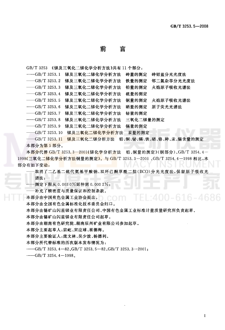 ICS77.120.99H13中华人民共和国国家标准GB/T3253.5-2008代替GB/T3253.3-2001,GB/T3254.4-1998锑及三氧化二锑化学分析方法铜量的测定火焰原子吸收光谱法UMENTMethods for chemical analysis of antimony and antimonytrioxide-Determination of copper content-Flame atomic absorption spectrometric methodHTTP://www.macylab.com TEL:400-616-46862008-03-31发布2008-09-01实施中华人民共和国国家质量监督检验检疫总局中国国家标准化管理委员会发布