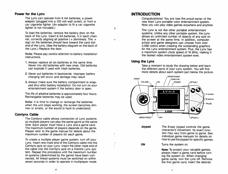 game card,and turn the system onNote:Looking at the screen from aagain.different angle than the one to which itwas adjusted may cause the screen toOFFTurns the system off.appear dim.Note:Your Lynx has been designedVOLUMEAdjust the sound level of a game.both for safety and to conserve batterypower.When using batteries,the LynxPOWERConnect the Lynx and an Atari powersystem will automatically shut itself offadaptor to a wall socket to saveafter four minutes of non-use.On ACbatteries.adaptor power,the unit's built-in shut-off mechanism will tumn the Lynx off ifCOMLYNXTMUse with one or more Comlynx cablesnot used for approximately one hour.to connect other Lynx machines formultiplayer games.OPTION 1An optional button used in some gamesPress for autofire missiles,turbo,andHEADPHONEUse with most standard portable head-s00n,phones.Plugging in headphones auto-matically disables the Lynx speaker.RESTARTPress OPTION 1 and PAUSE at thesame time to restart a game.Restart-The following drawing shows the back of the Lynx.ing the game usually returns you to theLook at it carefully to see how to insert batteries or atitle screen or options screen.game card.PAUSEPauses a game.Press PAUSE againto resume action.-Game cald doorOPTION 2Another optional button used in someame cardgames to give you even more capabili-ties and control.OPTION 2 may.forexample,allow you to use certainobjects or turn the music on or off.FLIPPress OPTION 2 and PAUSE at thesame time to flip the screen upsidedown and play with the joypad on theopposite side.This is great for lefties.Game cardOpen to insert game card.A buttonsBoth A buttons perform the samedoorfunction.Use the button which is mostcomfortable for you.See individualBattery door Slide open to insert 6 AA batteries.game manuals for the specific functionof the buttons.Inserting a Game CardFollow the steps listed below to insert a game card.B buttonsBoth B buttons perform the samefunction.Use the button which is most1.Open the game card door on the Lynx entertain-comfortable for you.See the manualment system.that came with your game card for2.Slide the game card into the game card slot,labeldetails on how to use these buttons.side down,as shown in the drawing.BRIGHTNESS Adjusts the screen from dark to light3.Close the game card door.Adjust the brightness for your viewing4.Press ON to switch on the Lynx.angle.23