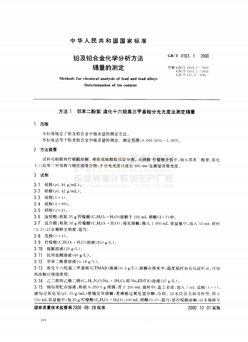 GB/T4103.1-2000前言木标准采用两种化学分析方法测定船及铅合金中的锡含墩。其中方法1是对GB/T1103.21983《铅基合金化学分析方法邻苯二酚素-十六烷基三甲基溴化铵光度法测定锡量、GB/T472.6-I984《铅锭化学分析方法邻苯二酚紫-溴化十六烷基三甲基铵分光光度法测定锡量》的修订:方法2是对(GBT4103.1-1983铅基合金化学分析方法碘其法测定锡量的重新确认,只进行编辑性修改。本标准遵守:GBT1.1-1993标准化工作导则第1单元:标准的起草与表述规则第】部分:标准缩写的基本规定GB/T1.4-1988标准化工作导则化学分析方法标准编写规定GB/T1467-1978冶金产品化学分析方法标准的总则及-·般规定GB/T7729-1987冶金产品化学分析分光光度法通则(GB/T17433一1998冶金产品化学分析基础术语本标准白生效之日起,代替GB/T4103.1一1983,GB/T4103.2-1983、GB/T472.6-1984,本标准由国家有色金属工业局提出。本标准由中国有色金属工业标准计量质址研究所妇日。T本标准由沈阳冶炼厂、白银有色金属公司西北铜加工厂负责起草。本标准方法】由白银有色金属公司西北铜加上厂起草,方法2由北京有色金属熔炼厂起草。本标准方法】主要起草人:潘峰:方法2主要起草人:黄美林、李继和。HIIP://www.macylab.com TEL:400-616-4686