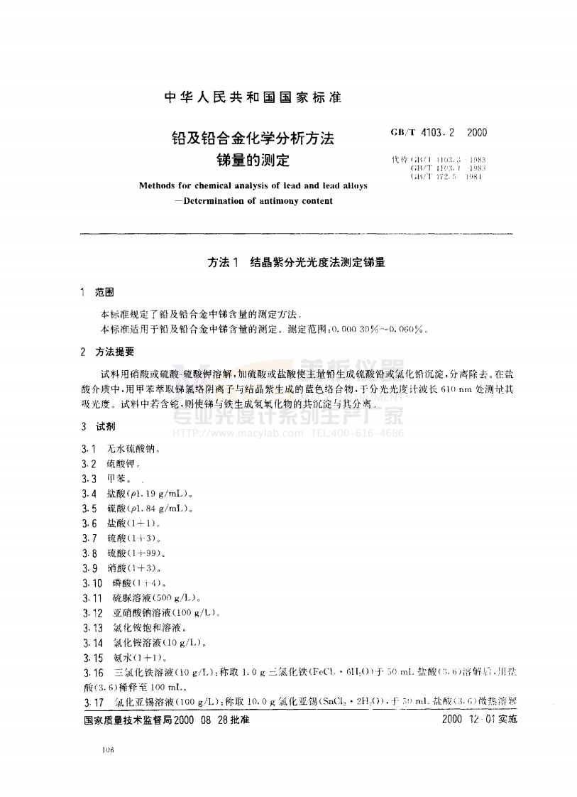 GB/T4103.2.2000前言本标准采用两种化学分新方法测定铅及铅合金中的梯含量。其中方法1是对GBT413.3·1983发铅基台金化学分析方法结晶紫光度法测定锑量》、GB/T472.5-1984《铅锭化学分析方法孔雀绿分光光度法测定锑址的修订:方法2是对G/T1103.4-1983铅基合金化学分析方法滨酸盐容量法测定锑过的修订本标准遵守:(GB/T1.1-1993标准化丁作导则第1单元:标准的起草与表述规则第1部分:标准编写的基本规定G:B/T1.4-一1988标准化工作导则化学分析方法标准编写规逆GB/T1467-1978治金产品化学分析方法标准的总则及-一般规定(GB/T7729一1987冶金产品化学分析分光光度法通则GB/T174331998冶金产品化学分析基础术语本标准自生效之日起,代替GB/T4103.3-1983,GB/T4103.4一1983、GB/T472.5-198,木标准油中图有台全得工业标整计造质经斯究所相。行仪昌本标准由国家有色金属工业局提出。本标准由沈阳治炼厂,白银有色金属公司州北铜加工厂负责起草。MEN本标准由白银有色金阔公司西北铜加工广起草。本标准方法1主要起草人:赵义;方法2主要起草人:於建中、杨桂平。/www.macylab.con400-616-4680105