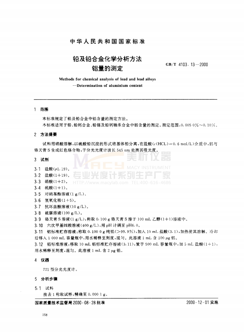 GB/T4103.13-2000前言本标准系首次制定。本标准遵守:GB/T1.1-1993标准化工作导则第1单元:标准的起草与表述规则第1部分:标准编写的基本规定GB/T1.4一1988标准化工作导则化学分析方法标准编写的规定GB/T1467一1978冶金产品化学分析方法标准的总则及一殷规定GB/T7729-1987冶金产品化学分析分光光度法通则GB/T17433-1998冶金产品化学分析基础术语本标准由国家有色金属工业局提出。本标准由中国有色金属工业标准计量质量研究所归口。本标准由沈阳冶炼厂、白银有色金属公司西北铜加工厂负责起草。本标准由沈阳治炼厂起草。本标准主要起草人:刘国红、张泉。美析仪器MACY INSTRUMENT专业光度计系列生产厂家HTTP://www.macylab.com TEL:400-616-4686157
