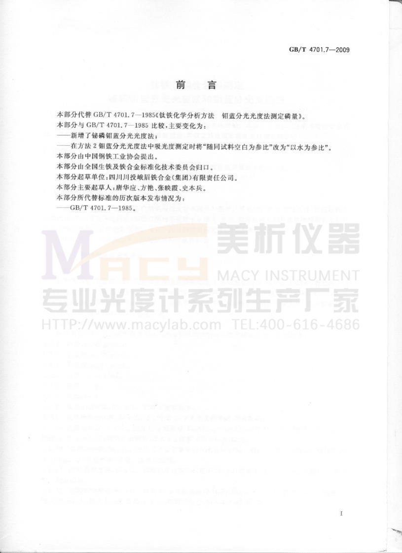 ICS77.100H11GB中华人民共和国国家标准GB/T4701.7-2009代替GB/T4701.7一1985钛铁磷含量的测定铋磷钼蓝分光光度法和钼蓝分光光度法Ferrotitanium-Determination of phosphorus content-Molybdobismuthylphosphoric blue spectrophotometric methodand the molybdenum blue spectrophotometric methodHTTP://www.macylab.com TEL:400-616-46862009-07-08发布2010-04-01实施中华人民共和国国家质量监督检验检疫总局中国国家标准化管理委员会发布