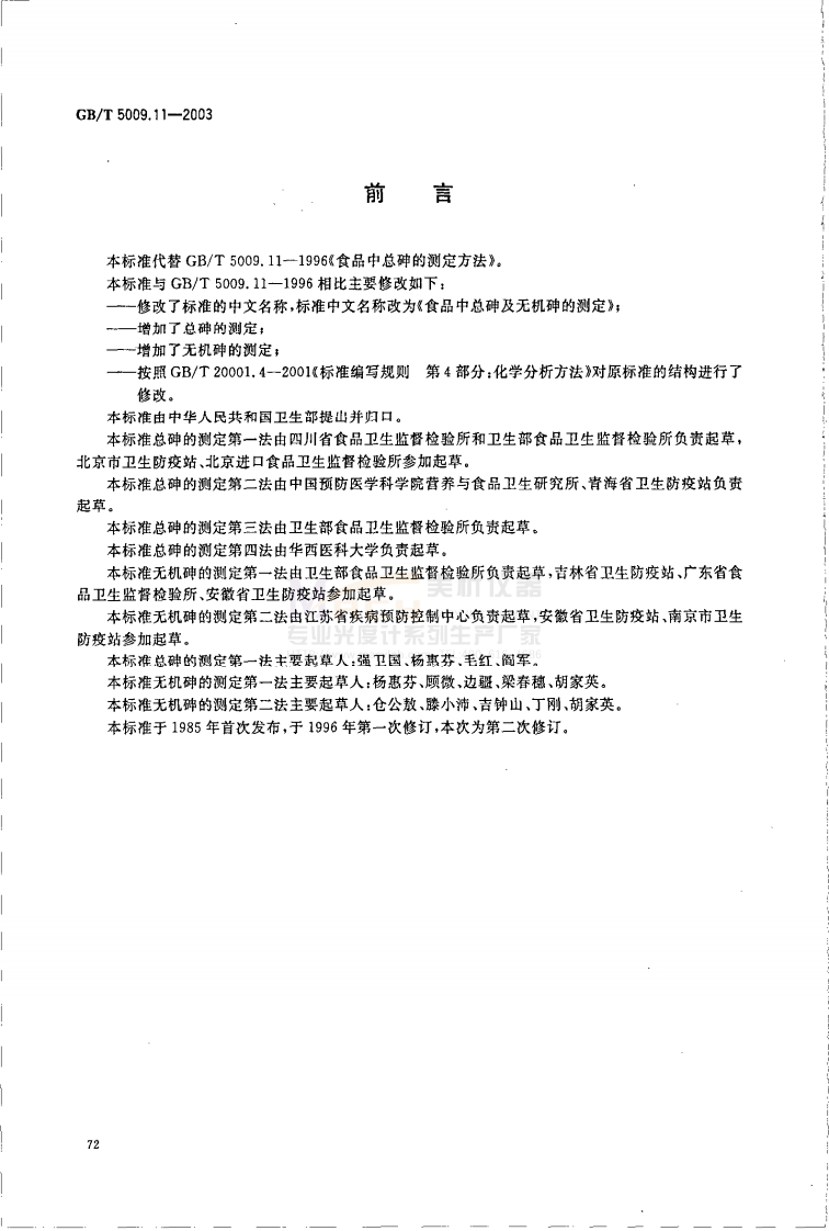 IcS67.040C53中华人民共和国国家标准GB/T5009.11一2003代替GB/T5009.11一1996食品中总砷及无机砷的测定Determination of total arsenic and abio-arsenic in foods专业光度计系列生产厂家HTTP://www.macylab.com TEL:400-616-46862003-08-11发布2004-01-01实施中华人民共和国卫生部中国国家标准化管理委员会发布