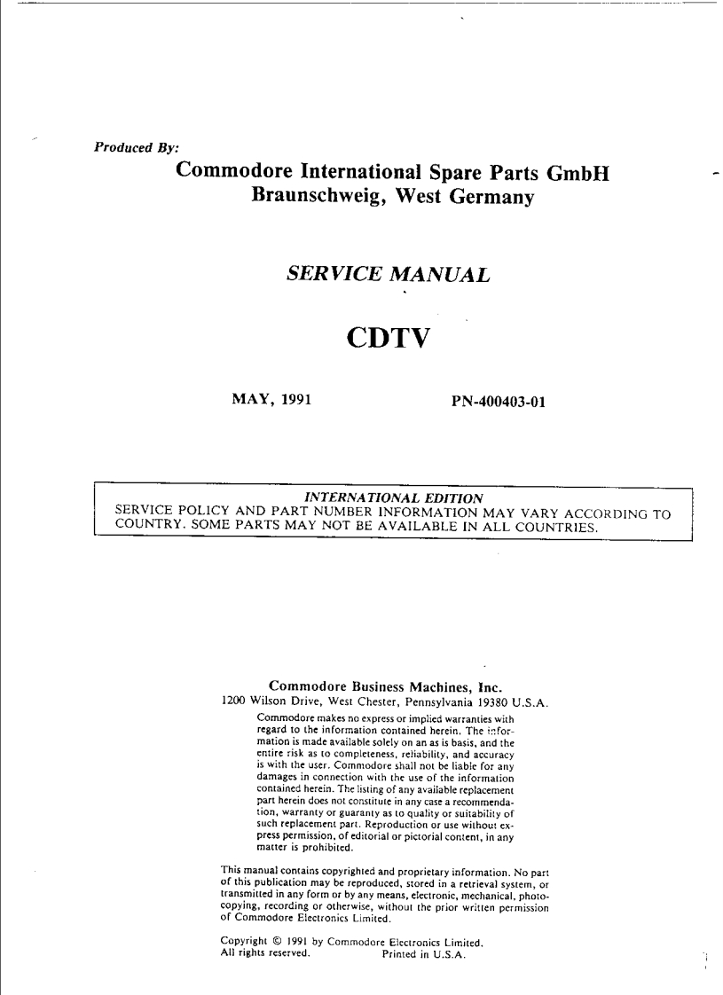 CDTV SERVICE MANUALTABLE OF CONTENTSSECTION 1-SPECIFICATIONS1.1 SPECIFICATIONS...........SECTION 4-PARTSSHIPPING ASSEMBLIES........................MAJOR ASSEMBLIES...................:4-2PCB COMPONENTS....................…4-3SECTION 5 -SCHEMATICSSCHEMATIC #252605,REV.A............……5-1