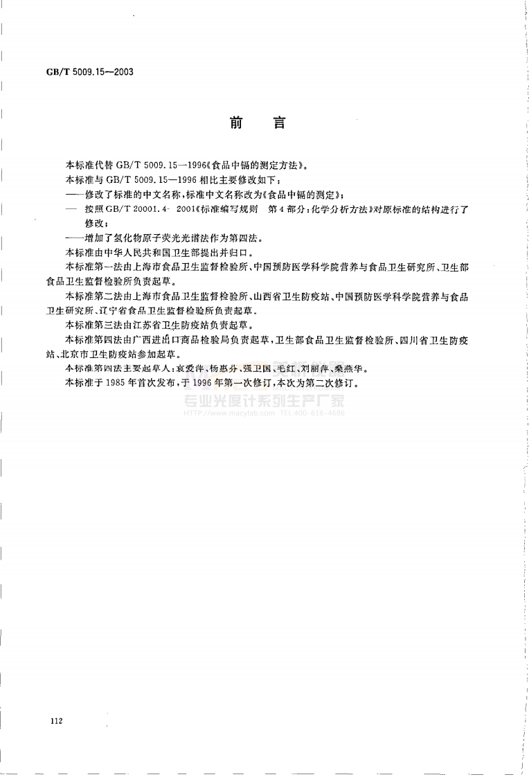 ICs67.040053中华人民共和国国家标准GB/T5009.15一2003代替GB/T5009.15一1996食品中镉的测定Determination of cadmium in foodsMACY INSTRUMEN专业光度计系列生产厂家HTTP.//www.macylab.com TEL:400-616-46862003-08-11发布2004-01-01实施中华人民共和国卫生部中国国家标准化管理委员会发布111