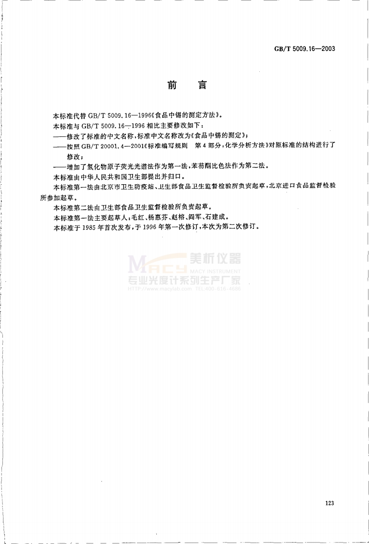 ICs67.040C53中华人民共和国国家标准GB/T5009.16一2003代替GB/T5009.16-1996食品中锡的测定Determination of tin in foodsMACY INSTRUMENT专业光度计系列生产厂家HTTP://www.macylab.com TEL.400-616-46862003-08-11发布2004-01-01实施中华人民共和国卫生部中国国家标准化管理委员会发布121