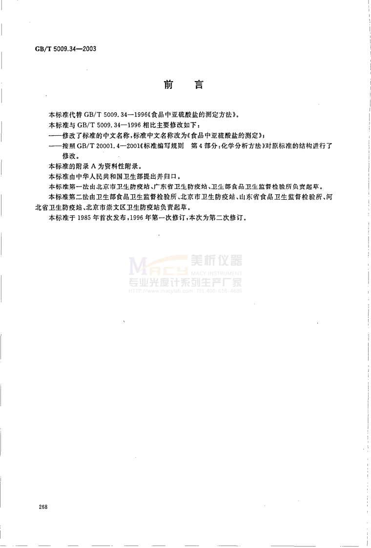 ICs67.040C53中华人民共和国国家标准GB/T5009.34-2003代替GB/T5009.34-1996食品中亚硫酸盐的测定Determination of sulphite in foodsMACY INSTRUMENT专业光度计系列生产厂家HTTP://www.macylab.com TEL:400-616-46862003-08-11发布2004-01-01实施中华人民共和国卫生部中国国家标准化管理委员会发布267