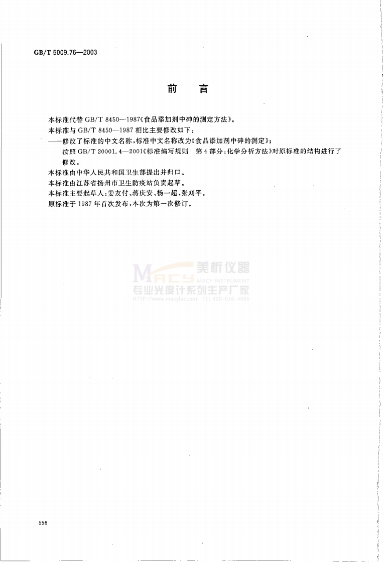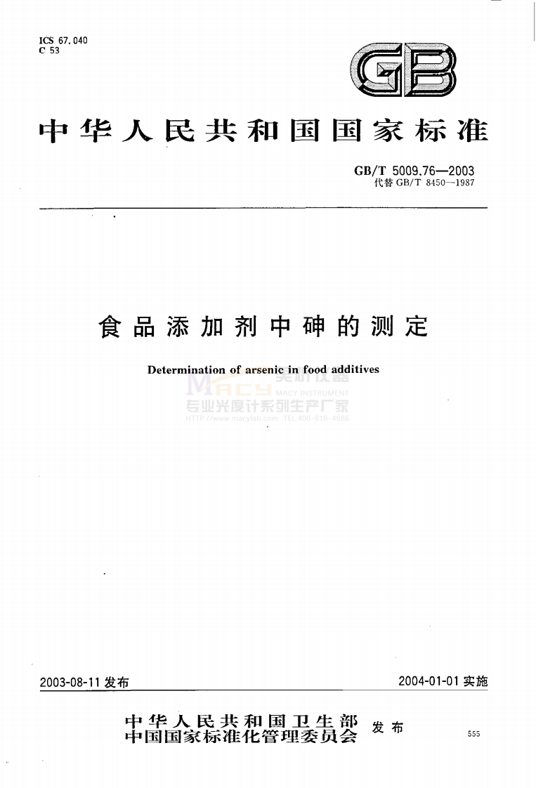 ICs67.040C53中华人民共和国国家标准GB/T5009.76-2003代替GB/T8450一1987食品添加剂中砷的测定Determination of arsenic in food additivesMACY INSTRUMEN专业光度计系列生产厂家HTP://www.macylab.com TE:400-61662003-08-11发布2004-01-01实施中华人民共和国卫生部中国国家标准化管理委员会发布555