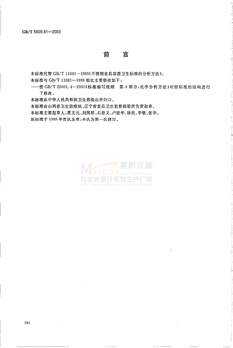 1CS67.040C53中华人民共和国国家标准GB/T5009.81一2003代替GB/T11681一1989不锈钢食具容器卫生标准的分析方法仪器Method for analysis of hygienic standard of stainlesssteel food containers and table wares2003-08-11发布2004-01-01实施中华人民共和国卫生部中国国家标准化管理委员会发布583