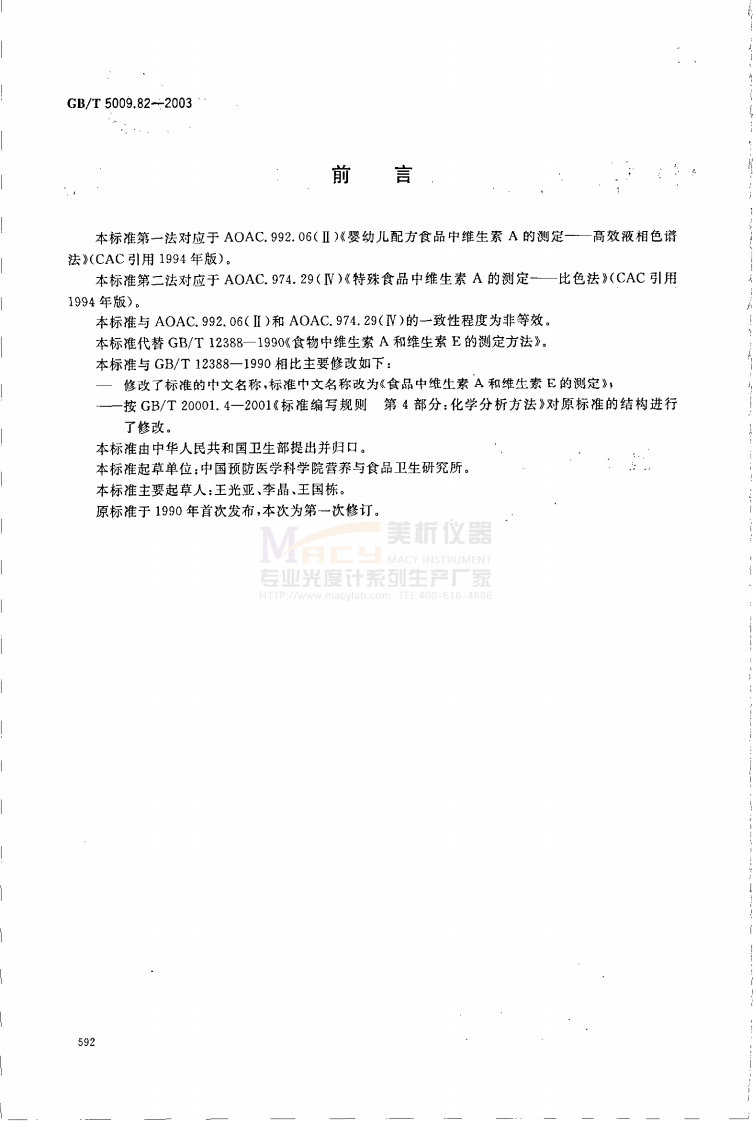 1Cs67.040c53中华人民共和国国家标准GB/T5009.82-2003代替GB/T12388-1990食品中维生素A和维生素E的测定Determination of retinol and tocopherol in foodsMACY INSTRUMEN专业光度计系列生产厂家HTTP://www.macylab.com TEL400-616-4682003-08-11发布2004-01-01实施中华人民共和国卫生部中国国家标准化管理委员会发布591