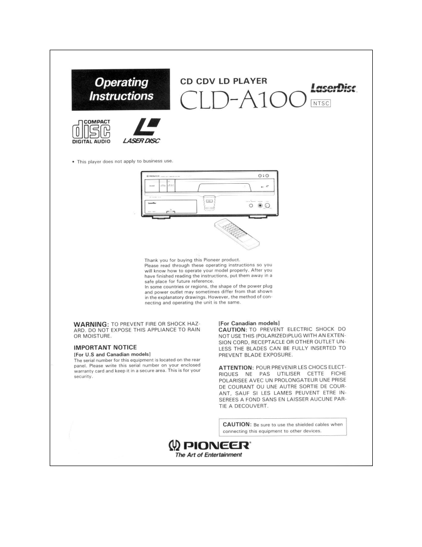 OperatingCD CDV LD PLAYERLaserDiscInstructionsCLD-A100NTSCdiscgDIGITAL AUDIOLASER DISCThis player does not apply to business use0:00.0Thank you for buying this Pioneer product.Please read through these operating instructions so youwill know how to operate your model properly.After youhave finished reading the instructions,put them away in asafe place for future reference.In some countries or regions,the shape of the power plugand power outlet may sometimes differ from that shownin the explanatory drawings.However,the method of con-necting and operating the unit is the same.WARNING:TO PREVENT FIRE OR SHOCK HAZ-[For Canadian models]ARD.DO NOT EXPOSE THIS APPLIANCE TO RAINCAUTION:TO PREVENT ELECTRIC SHOCK DOOR MOISTURE.NOT USE THIS (POLARIZED)PLUG WITH AN EXTEN-SION CORD,RECEPTACLE OR OTHER OUTLET UN.IMPORTANT NOTICELESS THE BLADES CAN BE FULLY INSERTED TO[For U.S and Canadian models]PREVENT BLADE EXPOSURE.The serial number for this equipment is located on the rearpanel.Please write this serial number on your enclosedwarranty card and keep it in a secure area.This is for yourATTENTION:POUR PREVENIR LES CHOCS ELECT-security.RIQUES NE PAS UTILISER CETTE FICHEPOLARISEE AVEC UN PROLONGATEUR UNE PRISEDE COURANT OU UNE AUTRE SORTIE DE COUR-ANT,SAUF SI LES LAMES PEUVENT ETRE IN-SEREES A FOND SANS EN LAISSER AUCUNE PAR-TIE A DECOUVERT.CAUTION:Be sure to use the shielded cables whenconnecting this equipment to other devices.PIONEERThe Art of Entertainment