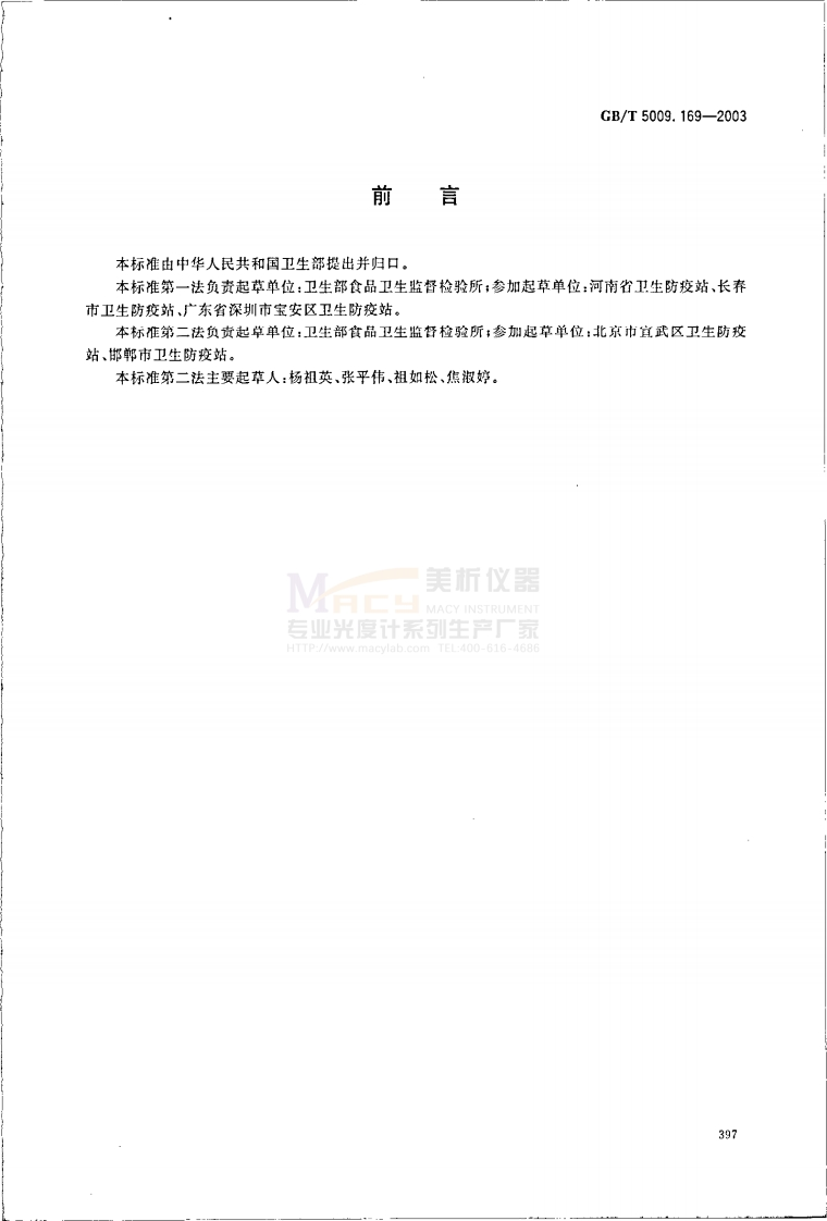 GBT5009.169-2003食品中牛磺酸的测定348072@abc4个月前发布关注私信0.20MB7页029GBT5009.169-2003食品中牛磺酸的测定此内容为付费资源,请付费后查看¥15¥23黄金会员免费钻石会员免费立即购买您当前未登录!建议登陆后购买,可保存购买订单付费资源 第1页 / 共7页 第2页 / 共7页 试读已结束,还剩5页,您可下载完整版后进行离线阅读 THE END标准规范 文本预览 1CS67.040C53中华人民共和国国家标准GB/T5009.169-2003食品中牛磺酸的测定Determination of taurine in foodsMACY INSTRUMEN专业光度计系列生产厂家HTTP://www.macylab.com TEL:400-616-46862003-08-11发布2004-01-01实施中华人民共和国卫生部396中国国家标准化管理委员会发布 查看更多 收起部分 喜欢就支持一下吧收藏