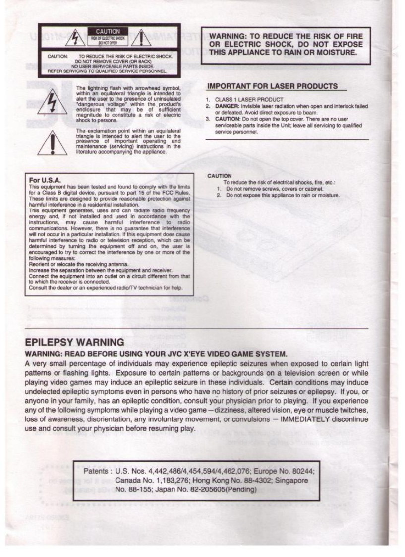 JVCMULTI ENTERTAINMENT SYSTEM RG-M10BUINSTRUCTIONSXEYE次Contents:Caution-Introduction--d泻6Identifying Parts-0Connecting-Operating the System--d56Playing JVC X'EYE-6Troubleshooting Chart---…16DIGITAL AUDIOGENESISJVC X'EYE hardware information---17COMPACTDIGITAL AUDIOSEGA CDGRAPHICSThank you very much for purchasing the RG-M10BU.In order to use it properly,please read thisinstruction manual carefully beforehand.Since the RG-M10BU features CD-ROM playing,you will be able to use it for games onSEGA CDs along with games on cartridges and music on CDs and CD+Gs(karaoke).●50000.00.0.000。。。000。。00。。。。1。。0。。。。。。。。。0.00E30580-2119A[J]