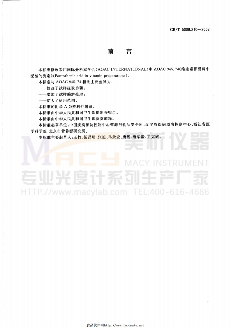 ICS67.040C53B中华人民共和国国家标准GB/T5009.210-2008食品中泛酸的测定义器Determination of pantothenic acid in foodsMACY INSTRUMENT专业光度计系列生产厂家HTTP://www.macylab.com TEL:400-616-46862008-11-21发布2009-03-01实施中华人民共和国卫生部中国国家标准化管理委员会发布食品伙伴网http:/m.foodmate.net