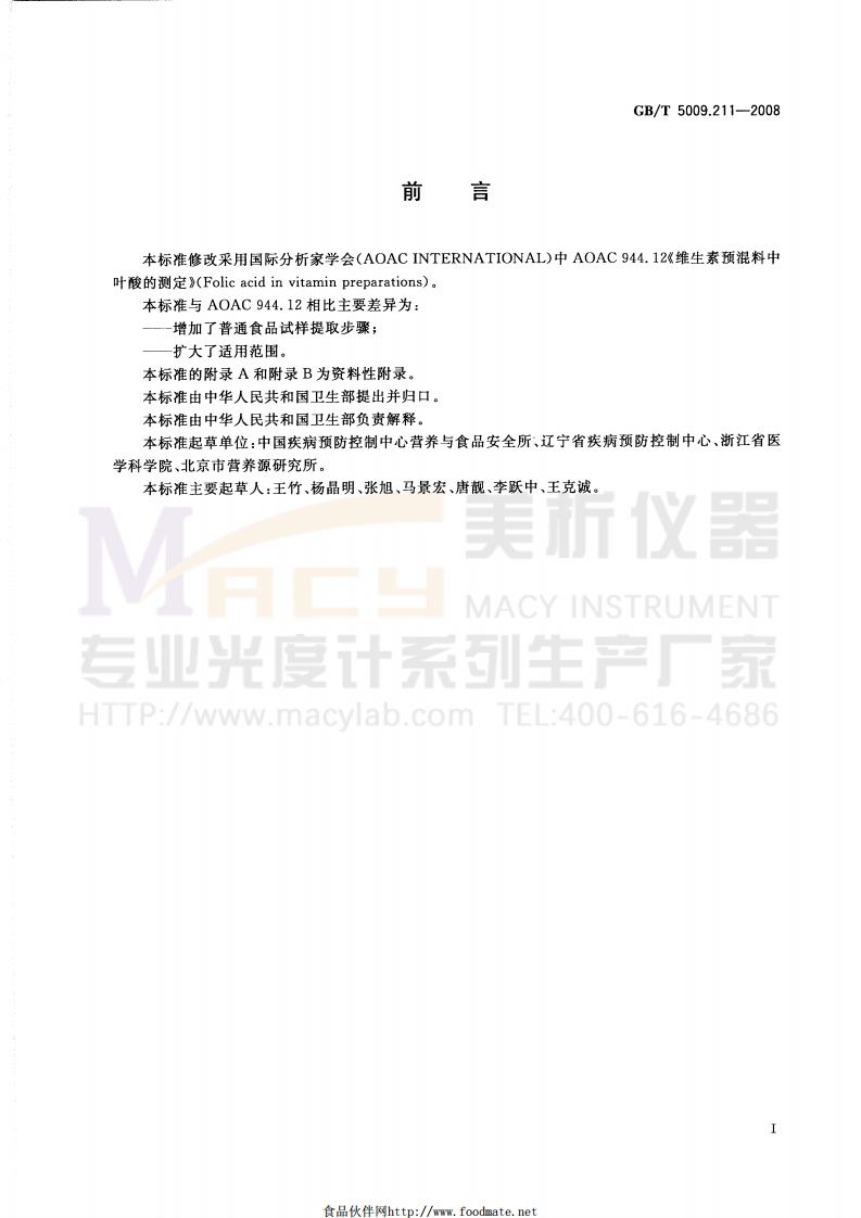 ICs67.040C53中华人民共和国国家标准GB/T5009.211-2008食品中叶酸的测定仪器Determination of folates in foodsMACY INSTRUMENT专业光度计系列生产厂家HTTP://www.macylab.com TEL:400-616-46862008-11-21发布2009-03-01实施中华人民共和国卫生部中国国家标准化管理委员会发布食品伙伴件网http:/wm.food恤ate.net