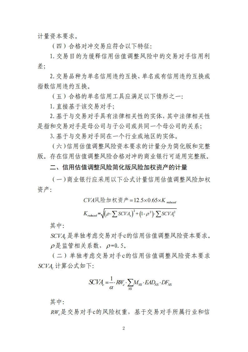 附件17信用估值调整风险加权资产计量规则一、总体要求(一)商业银行应对与非合格中央交易对手开展的衍生工具交易计量信用估值调整风险(CVA)资本要求,其中,非合格中央交易对手包括非中央交易对手和不合格中央交易对手,衍生工具的范围见本办法附件9第一部分(四)。商业银行无需计量证券融资交易的信用估值调整风险资本要求,其中,证券融资交易的范围见本办法附件9第一部分(五)。对于证券融资交易信用估值调整风险较大的商业银行,国家金融监督管理总局或其派出机构有权要求其额外计量该类业务的信用估值调整风险资本。(二)商业银行非合格中央交易对手衍生工具名义本金合计小于或等于8000亿元的,应采用简化方法,即取交易对手违约风险资本要求作为其信用估值调整风险资本要求。在此情况下,不认可信用估值调整风险对冲影响。(三)信用估值调整风险对冲工具可以是与其他交易对手开展的外部工具,也可以是与商业银行某一交易台开展的内部工具。如果外部信用估值调整风险对冲属于本部分(一)规定的范围,应对该对冲交易计量交易对手信用估值调整风险资本要求。合格的外部信用估值调整风险对冲工具无需计量市场风险资本,不合格的外部信用估值调整风险对冲工具视为交易账簿工具,并纳入市场风险资本计量框架。如果内部信用估值调整风险为合格对冲,信用估值调整风险交易台的头寸应纳入信用估值调整风险资本计量框架,其对应头寸作为交易账簿头寸纳入市场风险资本框架1