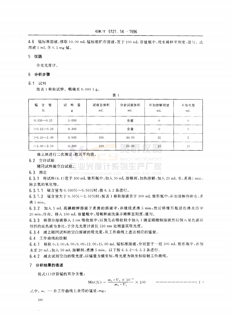 中华人民共和国国家标准GB/T5121.141996代学(B6122.485铜及铜合金化学分析方法锰量的测定B5122.1:8(56520.686(H855.387Copper and copper alloys-Determination of manganese content(38:3.17飞7第一篇方法1高碘酸钾分光光度法测定锰量1范围本标准规定了铜及蓟合金中锰含量的测定方法本标准适用于制及铜合金中锰含量的测定。测定范围:0.030%一2.50%。2引用标准下列标准所包含的条文,通过在本标准中引用而构成为本标准的条文。本标准出版时,所示版本均为有效。所有标准都会被修订,使用本标准的各方应探讨使用下列标准最新版本的可能性GB1,4一88标准化工作导则化学分析方迭标准编写规定目(GB1467…78治金产品化学分析方法标准的总则及-·般规定(GB7729一87冶金产品化学分析分光光度法通则NSTRUMENT(36379一86测试方法的精密度通过实验室间试验确定标准测试方法的重复性和再现性3方法提要HIIP://www.macylab.com TEL:400-616-4686试料用氢缄酸、溺酸,硝酸的混合酸溶解,加入高碘酸御将錳氧化为高锰酸,以硝酸钠选择性还原高锰酸而得到的底色液为参比.于分光光度计波长530m处测量其吸光度。4试剂4.1溶解剂:将300mL硼酸溶液(40g/L,)、30m】.氢氟酸(p1.13g/mL)、500mL.硝酸(pl.12g/ml.)和150mL水混匀。心存于塑料瓶中。4.2稀释液:向100mL硼酸溶液(40g/L)中加入1mL硫酸(p1.84g/mL),煮沸时加儿粒高碘酸钾将可能还原高锰酸的有机物氧化。4.3高碘酸钾溶液(50g/L):用硝酸(1+3)配制。4.4亚硝酸钠溶液(20g/L):用时现配。4.5锰标准贮:存溶液。4.5.1取儿克纯锰放在盛有约100ml.水和60~80m【.硫酸(1+3)的250ml.烧杯中.搅动儿分钟后,倾出酸液,用水洗涤儿次,然后放在内酮里,搅动,倾出丙酮。在100℃恒温箱里然干约2m,取出.放在干燥器中,冷却。4.5.2称取1.000g纯锰(1.5.1)于300ml.烧杯中,加人80mL水,缓慢加入40ml.硫酸(p1.81gml)溶解,煮沸数分钟,冷却。移入1000ml.容址瓶中,用水稀释至刻度,混匀。此溶液1ml.含1mg锰。国家技术监督局1996-11-04批准199704-01实施265