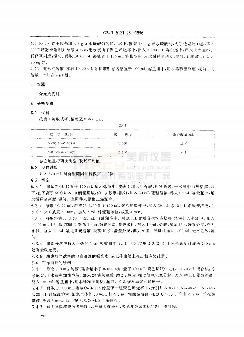 中华人民共和国国家标准GBT5121.231996代替(,B3122.158铜及铜合金化学分析方法硅量的测定(:136520.14GB802.12(:B8551.0Copper and copper alloys--Determination of silicon content(1B8550.21第一篇方法1萃取相蓝分光光度法测定硅量1范围本标准规定了铜及钢合金中硅含量的测量方法。本标准活上铜及铜合金中硅含敏的测定。测定范围:0.0010%0.25%.2引用标准下列标难所包含的条文,通过在本标准中引用而构成为本标准的茶文。木标准出版时,所示版本均为有效。所有标准都会被修∫,使用本标准的各方应探讨使用下列标准最新版本的可能性。(GB」.488标准化工作导则化学分析方法标准编写规定(GB1467一78治金产品化学分析方法标准的总则及一般规定(B7729一87治金产品化学分析分光光度法浦如INSTRUMENT3方法提要专业光生产厂家/www.macylab.com TEL:400-616-4686试料用盐酸、硝酸和氢氯酸溶解,在做酸性溶液中硅与钼酸铵形成硅钼酸。于硝酸溶液中用MK茶取,用就化亚锡还原难钼酸为钼蓝。于分光光度计波长740m处测量吸光度。4试剂本方法所用水均为二次去高子水。试剂均贮存于聚乙烯瓢中。4.1尿素。4.2尤水乙辟。4.3混合酸:于60mL水中加入30mL.盐酸(p1.19g/mL,高纯),10mL硝酸(p1.12gml,高纯)。4.4氢缄酸(p1.13g/mL),优级纯。4.5硼酸溶液(50g/L)。4.61酸铵(NI1:)MO,O2:·4H,)]溶液(100g/L,高纯。4.7柠酸(CH.(),·HO)溶液(500gL)。4.8硝酸(1十3),高纯。4.94甲基-戊剧2。4.10轮酸(1+9).高纯.4.11化亚锡溶液(10g/L.):称取1g风化亚锡(SCz·2HO),加入20ml.盐酸(p1.19gmL,高纯),加热使其溶解,冷却,用水稀释至100ml。用时现配。4.12陆标准:存溶液:称取0.4279g预先经1000℃灼烧并子下燥器中冷却至爷温的:氧化硅国家技术监督局1996-1104批准19970401实施2