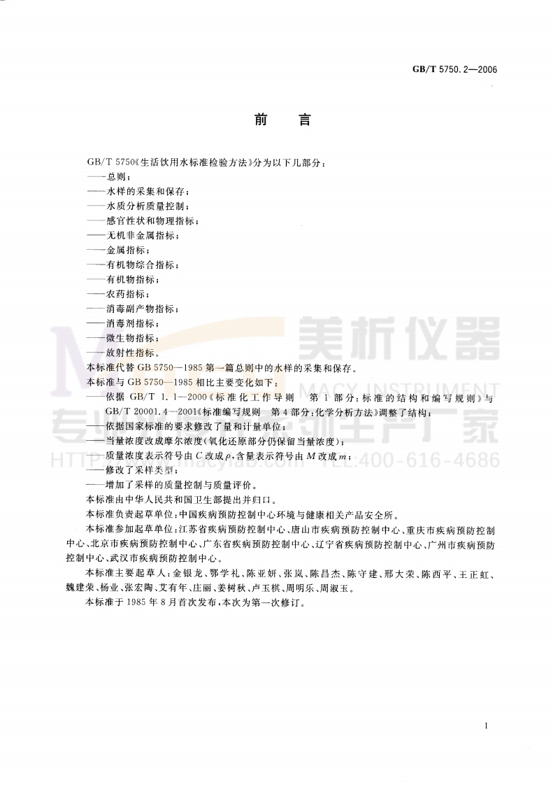 ICS13.060C51GB中华人民共和国国家标准GB/T5750.2-2006部分代替GB/T5750一1985生活饮用水标准检验方法水样的采集与保存义器Standard examination methods for drinking water-Collection and preservation of water samples专业光度系列王厂家HTTP://www.macylab.com TEL:400-616-46862006-12-29发布2007-07-01实施中华人民共和国卫生部中国国家标准化管理委员会发布