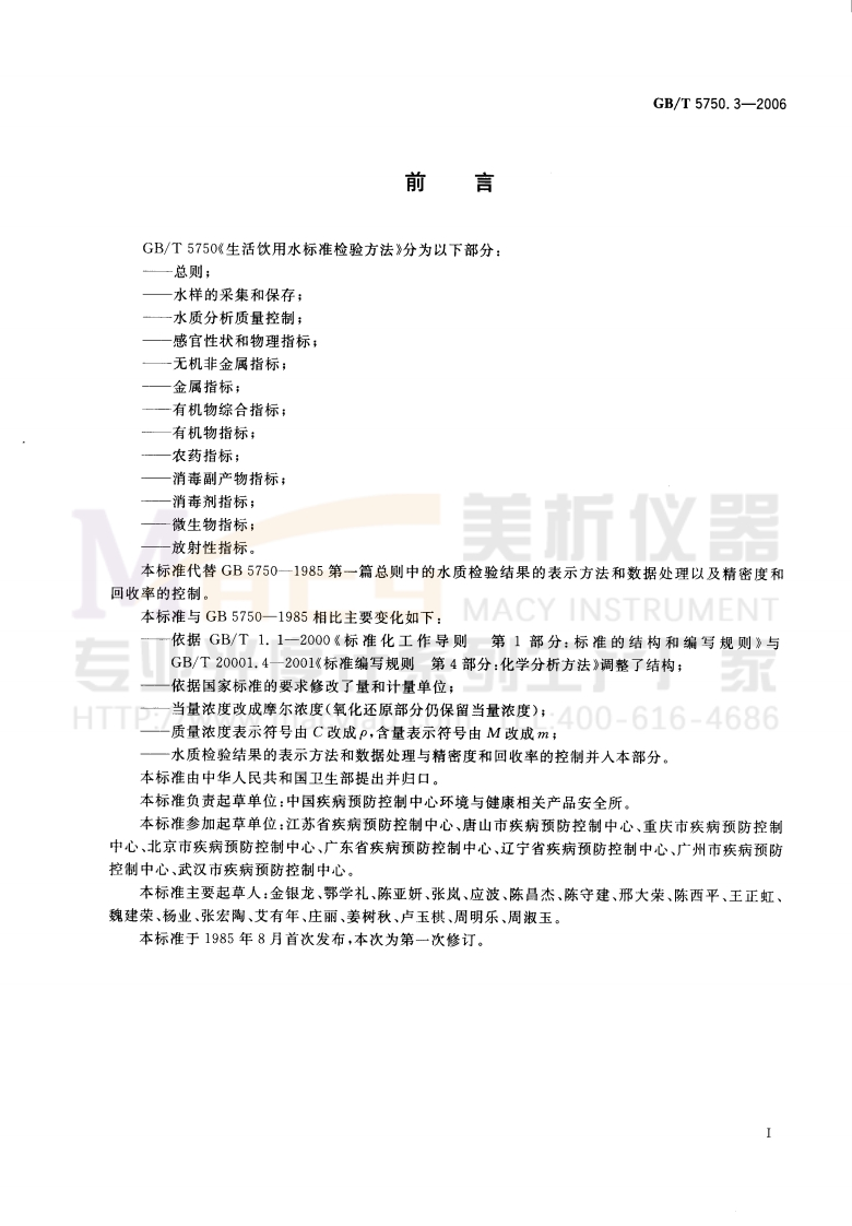 ICS13.060C51GB中华人民共和国国家标准GB/T5750.3-2006部分代替GB/T5750一1985生活饮用水标准检验方法水质分析质量控制Standard examination methods for drinking water-Water analysis quality control专业光度产厂家HTTP://www.macylab.com TEL:400-616-46862006-12-29发布2007-07-01实施中华人民共和国卫生部中国国家标准化管理委员会发布