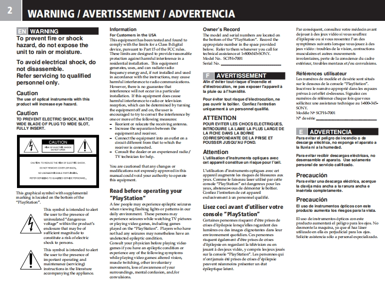 SONY386267羽-11(1)PlayStationENEnglishFrancaisEspanolPLrystatlnConnedtor sectionSection connecteurSeccion de conectoresInstruction ManualRESET buttonTouche RESETBoton RESET (REINICIO)Thank you for purchasing the "PlayStation"video game consolePOWER button andBouton etindicateurBoton e indicadorYou can enjoy plying a CD-ROM disc withindicatorPOWERPOWERboth the "Plays包tion'logo and [o Tue可designation,and audioCD dises with this unitCouverde duBeforeoperating the unit please read thisDisc covercompartiment a disqueCubierta del discomanual and retain it for future reference.OPEN buttonTouche OPENBoton OPEN (APERTURA)Manuel d'utilisationNous vous remercions d'avoir fait Y'acquisitionFentes pour cartesRanuras de las tarjetasd'une console "PayStation".Memory card slotsmemoirede memoriaVous pouvez utiliser avec cet appareil desdisques CD-ROM por也nt le l3Controller portsPorts de manettesPuertos del mando"PlayStation",b designation ainsique des CD audia.Avant de fairefonctionner cetappareil,lisezattentivement le present moded'emploi etcorservez-le pour toute reference uherieureManual de InstruccionesL2 button R2 buttonTouche L2,touche R2L2 boton R2 boton,L1 button R1 buttontouche L1.touche R1L1 boton R1 botonGracias por su compra del juego "PlyStation".Con este aparato podrd jugar con disoos CD.ROM que traiganellogotipo "PlyStation"y bDirectional buttonsTouches directionnellesBotones de direcdiondesignac血四como如ar击cscompactos de audio.Antes de poner a funcionar este aparato,por△.O,X,口buttonsTouches△.O,X,口△.O,X.口botonesfavor lea este manual y conservel paraaosl包rlo en el futuroBoton STARTSTART buttonTouche START(CO MIENZO)Interruptor paraInterrupteur modefundonamientods葩Analog mode swit chanalogiqueanalogicoBoton SELECTSELECT buttonTouche SELECT(SELECCION)SCPH-7001Joystick gauchePalanca izquierda.Leftstick.Right stickJoystick droite.Palanca derecha.0196,19%6,1997,1998 Sor Computor Entertainment ho.L3 button R3 buttonTouche L3.Touche R3L3 Boton R3 Boton
