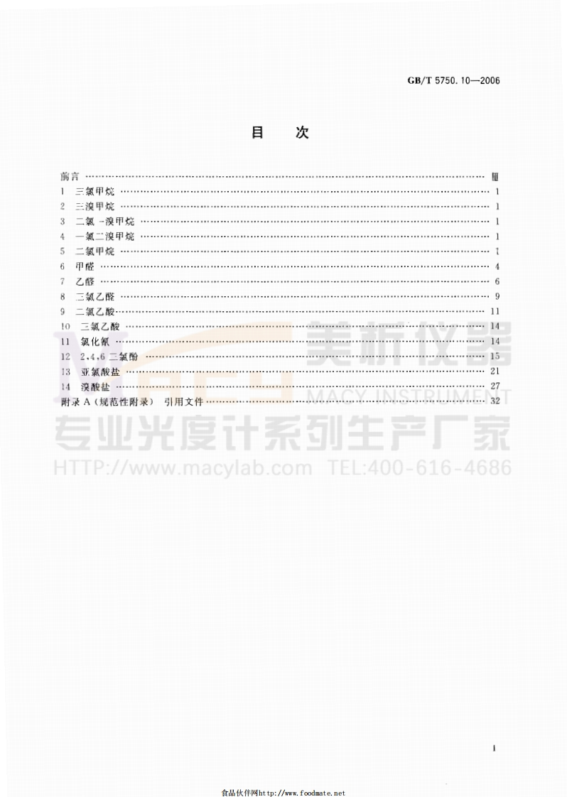 ICs13.060C51中华人民共和国国家标准GB/T5750.10-2006部分代替GB/T5750-1985生活饮用水标准检验方法消毒副产物指标义器Standard examination methods for drinking water专I光Disinfection by-products parameters厂家HTTP://www.macylab.com TEL:400-616-46862006-12-29发布2007-07-01实施中华人民共和国卫生部中国国家标准化管理委员会发布食品伙伴网tp:foodmte.net