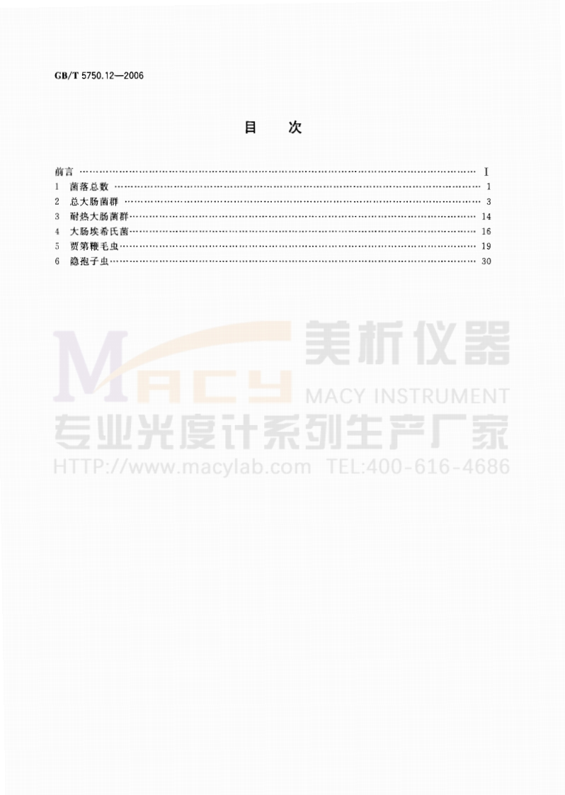 1CS13.060C51B中华人民共和国国家标准GB/T5750.12-2006部分代膂GB/T5750一1985生活饮用水标准检验方法微生物指标器Standard examination methods for drinking water专业光mMicrobiological parameters产厂家HTTP://www.macylab.com TEL:400-616-46862006-12-29发布2007-07-01实施中华人民共和国卫生部中国国家标准化管理委员会发布