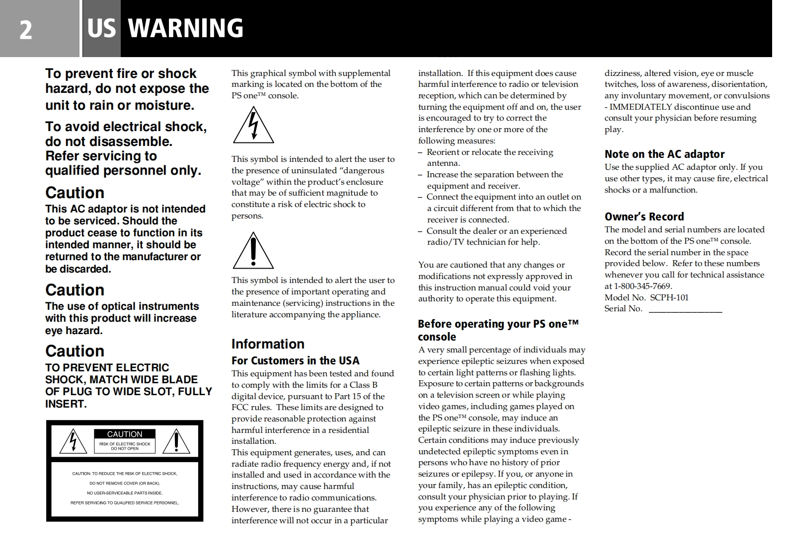 SONY3-065-224-14(1)NTBC Uc]EnglishFRPlaystation (PSone")FrancaisEspanolConnector sectionSection des connecteursSeccion de conectoresI/((on/standby)Boton I/((encendido/Instruction manual/RESET button andBoutonI/(marche/veille)espera)/RESET (reinicio)e1/(indicator/RESET et indicateur 1/Cindicador I/(Thank you for purchasing the PlayStation(PS oneTM)video game console.You can play CD-ROM discs which haveCouvercle duboth the PlayStation logo andDisc covercompartiment a disqueCubierta del discoNTscU/c]designation,as well as audioCDs with this unit.Before using thisproduct,carefully read this instruction合(open)buttonBouton合(ouvrir)Boton合(abrir)manual and retain it for future reference.Ranuras paraMode d'emploiFentes pour MEMORY CARDMEMORY CARDNous vous remercions d'avoir faitMEMORY CARD slots(carte memoire)(tarjeta de memoria)l'acquisition de la console dejeux videoPlayStation(PS oneTM).Vous pouvez utiliser avec cet appareil desController portsPorts de manettePuertos de controldisques CD-ROM portant le logoPlayStationg et la designation NTsc u/c]ainsi que des CD audio.L2 button,R2 button,Touche L2,touche R2Boton L2,boton R2L1 button,R1 buttontouche L1,touche R1boton L1,boton R1Avant d'utiliser ce produit,lisezattentivement ce mode d'emploietconservez-le pour pouvoir vous y reporterDirectional buttonsTouches directionnellesBotones de direccionulterieurement.△button,O button,Touche△,touche O,Boton△,boton O,Manual de instruccionesX button,▣buttontouche X,touche▣boton X,boton☐Gracias por adquirir la consola devideojuegos PlayStation(PS oneTM).Touche STARTSTART button(de mise en marche)Boton START(inicio)Con este aparato podra jugar con discosCD-ROM que tengan el logotipoTouche de mode ANALOGBoton modo ANALOGPlayStationy la designacion NTSc U/c]ANALOG mode button(analogique)(analogico)asi como reproducir CD audio.Antes de utilizar este producto,leaSELECT buttonTouche(de selection)Boton SELECT (seleccion)detenidamente este manual de instruccionesy conservelo para consultarlo en el futuro.Left analog stick,Manche analogique gauche,Joystick analogico izquierdo,right analog stick,manche analogique droit,joystick analogico derecho,SCPH-101/94015L3 button,R3 buttontouche L3,touche R3boton L3 ,boton R32003 Sony Computer Entertainment Inc.All rights reserved.d泻范