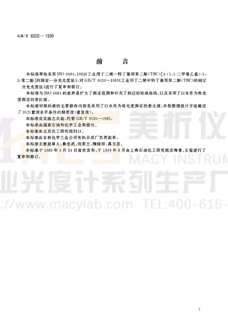 1c971.080.10G15中华人民共和国国家标准GB/T6020-1999eqv IS06684:1982工业用丁二烯中特丁基邻苯二酚(TBC)的测定分光光度法INSTRUButadiene for industrial use-Determination of tert-butyl-catechol(TBC)[4-(1,1-dimethylethyl)-1,2-benzenediol]-Spectrometric method//www.macylab.com TEL:400-6161999-08-10发布2000-06-01实施国家质量技术监督局发布