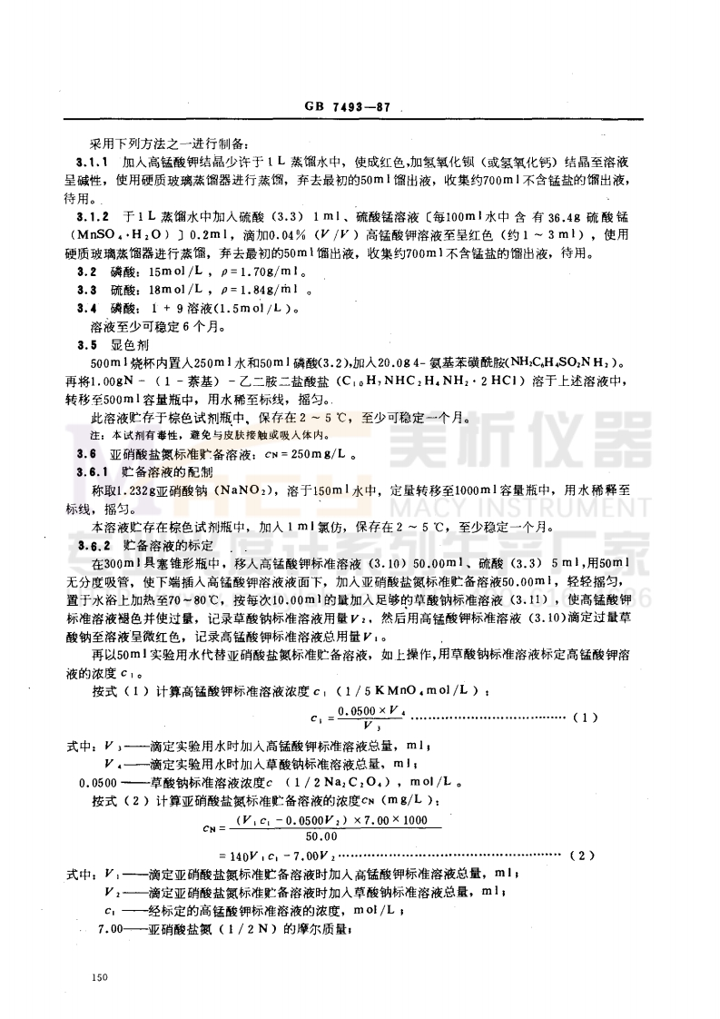 中华人民共和国国家标准UDC614.777÷543.42水质亚硝酸盐氮的测定GB7493-87分光光度法Water quality-Determination of nitrogen(nitrite)-Spectrophotometric method本标准等效采用1S06777一1984《水质亚硝酸盐氮氨测定分子吸收分光光度法》。本标准根据我国标准的格式对IS06777一1984标准技术上稍作修改和补充。1适用范围本标准规定了用分光光度法测定饮用水、地下水、地面水及废水中亚硝酸盐氮的方法。1.1测定上限当试份取最大体积(50m1)时,用本方法可以测定亚硝酸盐氮浓度高达0.20mg/L。1.2最低检出浓度采用光程长为10mm的比色皿l,试份体积为50m【,以吸光度0.01单位所对应的浓度值为最低检出限浓度,此值为0.003mg/L。采用光程长为30mm的比色皿,试份体积为50m1,最低检出浓度为0.001m8/L。FT1.3灵敏度采用光程长为10mm的比色孤,试份体积为50m1时,亚硝酸盐氮浓度c=0.20mg/L,给出的吸光度约为0.67单位。1.4干扰TD当试样pH>11时,可能遇到某些干扰,避此情况,可向试份中加人酚酞溶液(3.12)1滴,边搅拌边逐滴加人磷酸溶液(3.4),至红色刚消失。经此处理,则在加入显色剂后,体系PH值为1.8±0.3,而不影响定。试样如有颜色和悬浮物,可向每100m1试样中加入2m1氢氧化铝悬浮液(3.9),搅拌,静置,过滤,弃去25m1初滤液后,再取试份测定。水样中常见的可能产生千扰物质的含最范围见附录A。其中氯胺、氨、硫代硫酸盐、聚磷酸钠和三价铁离子有明显干扰。2原理在磷酸介质中,pH值为l.8时,试份中的亚硝酸根离子与4-氨基苯碱酰胺(4-aminoben之enesulfonamide)反应生成重氮盐,它再与N-(1-萘基)-乙二胺二盐陆盐〔N-(1~naphthyl-1,2-diaminoethane dihydrochio-ride]偶联生成红色染料,在540nm波长处测定吸光度。如果使用光程长为10mm的比色皿l,亚硝酸盐氮的浓度在0.2mg/L以内其呈色符合比尔定律。3试剂在测定过程中,除非另有说明,均使用符合国家标准或专业标准的分析纯试剂,实验用水均为无亚硝酸盐的二次蒸馏水。3.1实验用水国家环境保护局1987-03-14批准1987-08:01实施149
