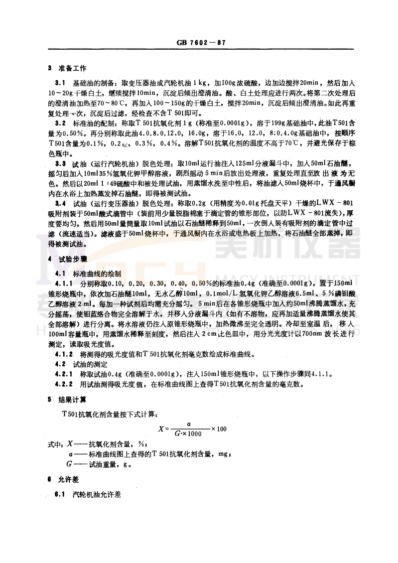 中华人民共和国国家标准运行中汽轮机油、变压器油UDC621.892.098:543.06T501抗氧化剂含量测定法GB7602-87(分光光度法)Determination of T501 oxidation inhibitorcontent in transformer and turbine oils inservice by spectrophotometric method本方法适用于运行中汽轮机油和变压器油中2,6-二叔丁基对甲基酚(简称T501)含量的测定。以石油醚、乙醇作溶剂,磷钼酸作显色剂,基于T501在碱性溶液中生成钼蓝络合物,利用其溶于水中的性质,采用分光光度计法测定。1仪器1.1分光光度计:72型、721型或其他型号。1.2移液管:2、10ml。美析仪器1.3锥形烧瓶:150ml。1.4分液漏斗:125、200ml。1.5容量瓶:100ml。1.6量筒:10、50ml。MACY INSTRUMENT1.7水浴或电热板。1.8烧杯50ml。1.9酸式滴定管:50ml。计系列生产厂家■2试剂www.macylab.com TEL:400-616-46862.1无水乙醇。2.2氢氧化钾:分析纯,配成0.1mol/L的无水乙醇溶液。2.3磷钼酸:分析纯,配成5%无水乙醇溶液,过滤于棕色瓶中,放到暗处保存。24硫酸:分析纯。2.535%氢氧化钾甲醇溶液:取氢氧化钾35g(称准至0.1g),溶于25ml蒸馏水中,再用甲醇稀释至100ml。2.6甲醇:分析纯。2.72,6-二叔丁基对甲酚:化学纯。2.8·活性白土。2.9LWX-801吸附剂。2.10石油醚:分析纯,沸点范围30~60℃或60~90℃。2.11脱脂棉。国家标准局1987-03-26批准1988-01-01实施