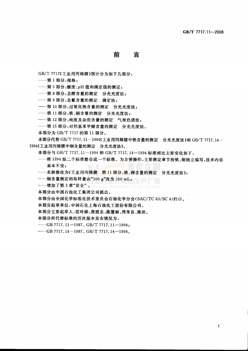 1CS71.080.30G17中华人民共和国国家标准GB/T7717.11-2008代替GB/T7717.11一1994、GB/T7717.14-1994工业用丙烯腈第11部分:铁、铜含量的测定分光光度法Acrylonitrile for industrial use-Part 11:Determination of content of iron and copper-Spectrophotometric method2008-06-19发布2009-02-01实施中华人民共和国国家质量监督检验检疫总局中国国家标准化管理委员会发布