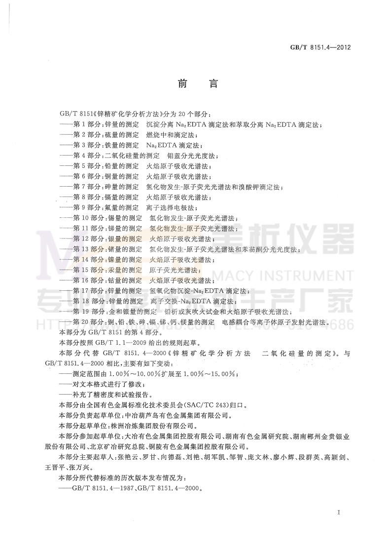 ICS77.120.60H131中华人民共和国国家标准GB/T8151.4-2012代替GB/T8151.4-2000锌精矿化学分析方法第4部分:二氧化硅量的测定钼蓝分光光度法STRUMENT专吧Methods for chemical analysis of zinc concentrates-Part 4:Determination of silicon dioxide content-WWW.Molybdenum blue spectrophotometry-616-46862012-12-31发布2013-10-01实施中华人民共和国国家质量监督检验检疫总局中国国家标准化管理委员会发布数码防伪
