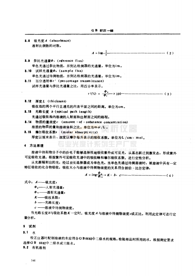 中华人民共和国国家标准化学试剂UDC543.06:54-41分子吸收分光光度法通则(紫外和可见光部分)GB9721-88C hemical reagentGeneral rules for the molecular absorptlon spectrophotom etry(ultravlolet and vis lble1主题内容与适用范图本标准规定了化学试剂分子吸收分光光度法(紫外和可见光部分)对仪器的要求和测定方法。本标准适用于波长在200~850m之间,无机化学试剂中杂质含量的测定及有机化学试剂、指示剂和特效试剂的定性及定量分析。2引用标准美析仪器GB6O2化学试剂杂质测定用标准溶液的制备ACY INSTRUMENGB6682实验室用水规格光度计系列生产厂家8术语及符号HTTP://www.macylab.com TEL:400-616-46863.1波长A(w a velength)在周期被传播方向上,相邻两波同相位点间的距离。单位为m。3.2吸收峰1量大(absorption peak)吸收光谱中吸收最大的波长。单位为nm。8.3吸收光谐(absorption spect rum)待测物浓度和吸收池厚度不变时,吸光度(或吸光度的任意函数)对应波长(或波长的任意函数)的曲线。&.4光谱带宽(spectral bandw idth)用光谱强度的二分之一处的宽度表示。8.5入射光通量Φ。(incident flux)照射介质表面的光通量。单位为1m。8:6透射光通量:,(transmitted ffux)穿过介质内部后射出的光通量。单位为1m。8.7透射比r(transmittance)透射光通量和人射光通量之比。。中华人民共和国化学工业部188-6-20批准1989-04-01实施145